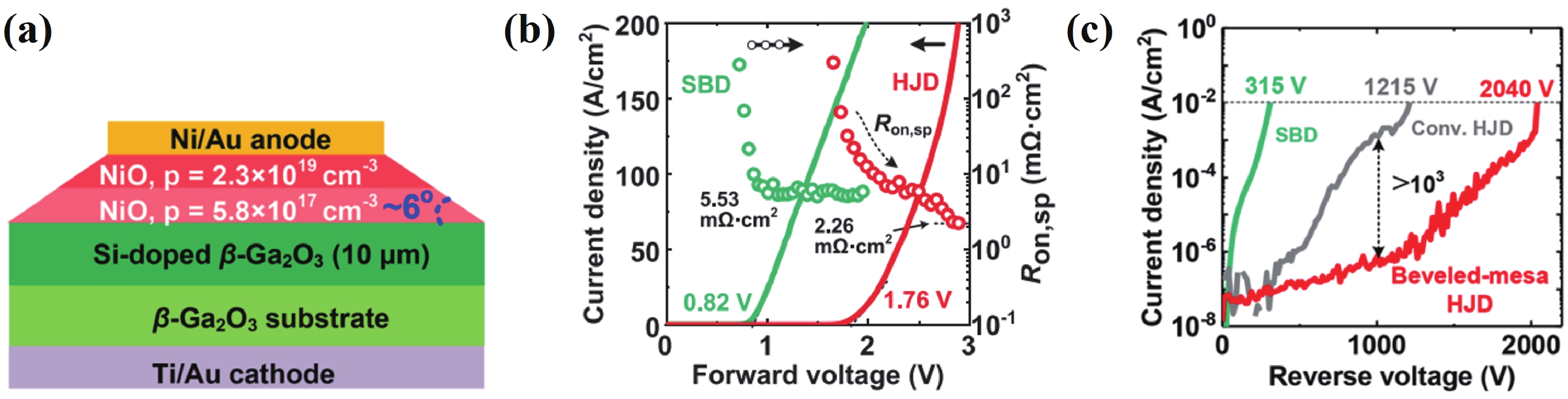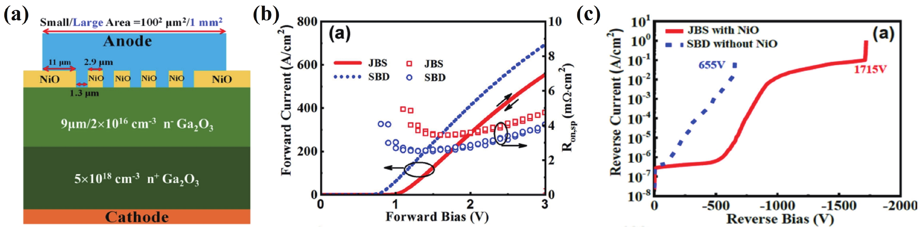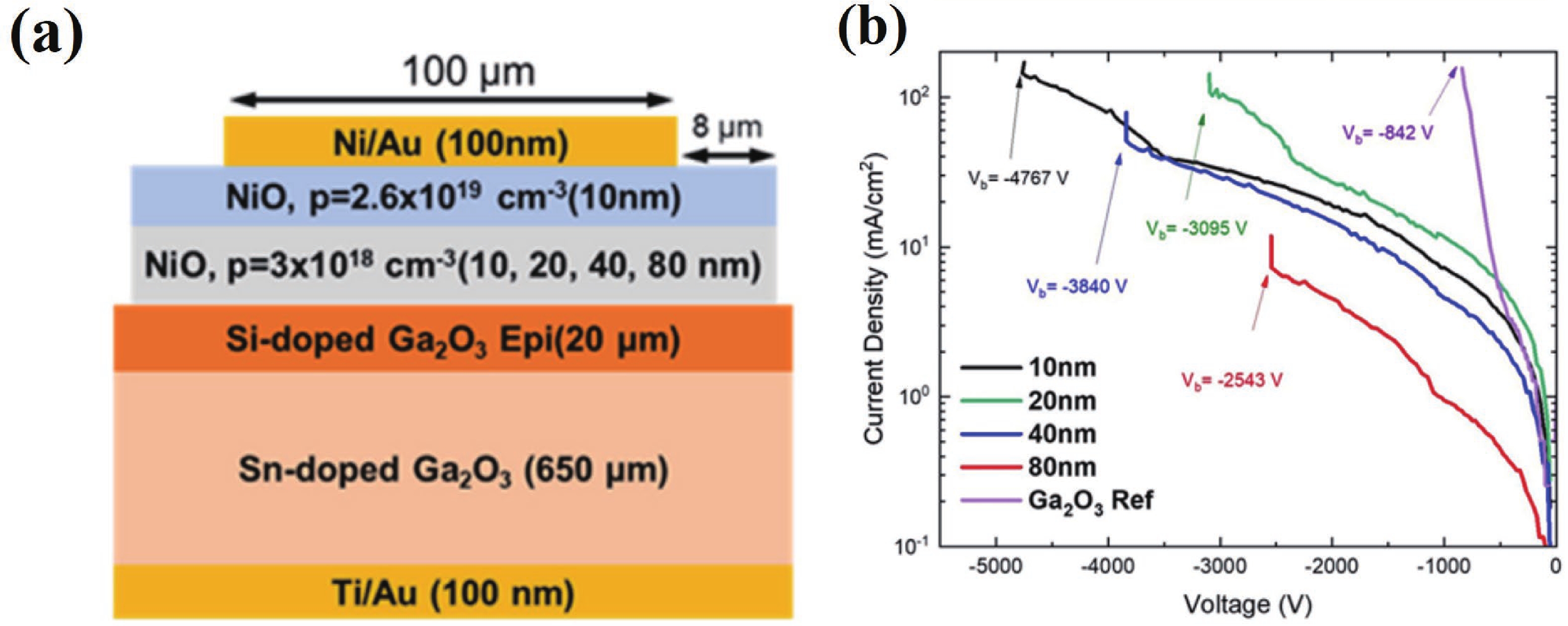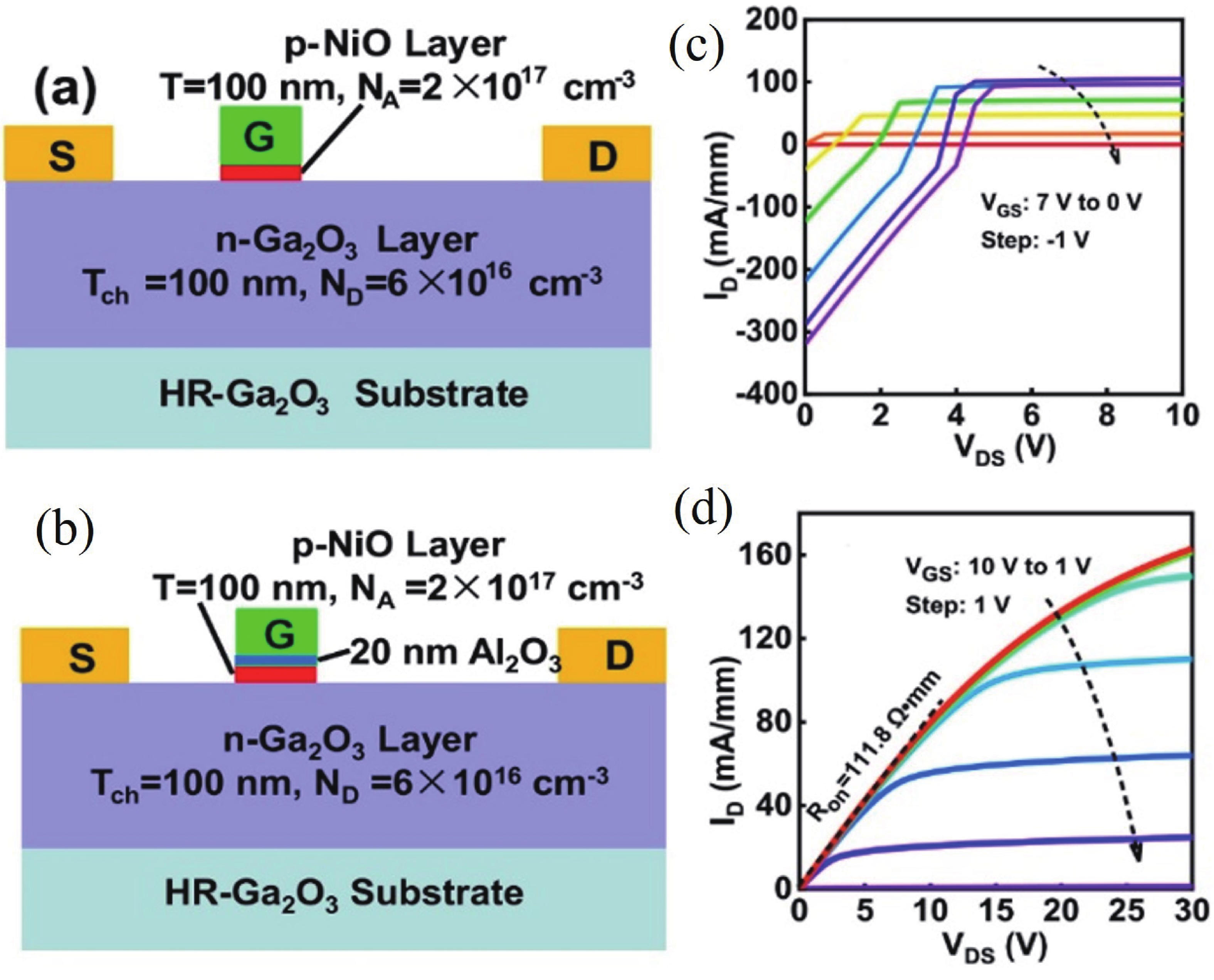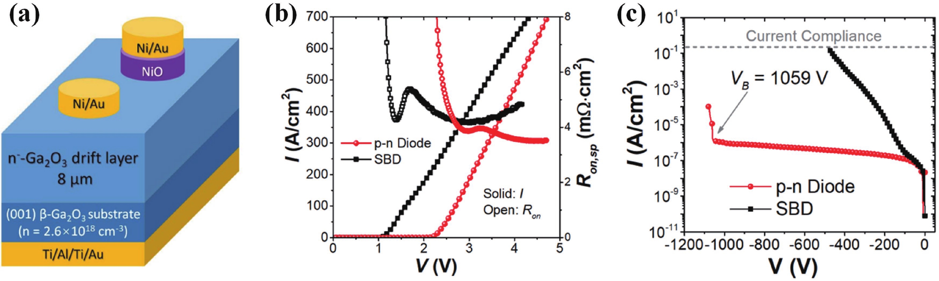 Beta gallium oxide (β-Ga2O3) has attracted significant attention for applications in power electronics due to its ultra-wide bandgap of ~ 4.8 eV and the large critical electric field of 8 MV/cm. These properties yield a high Baliga’s figures of merit (BFOM) of more than 3000. Though β-Ga2O3 possesses superior material properties, the lack of p-type doping is the main obstacle that hinders the development of β-Ga2O3-based power devices for commercial use. Constructing heterojunctions by employing other p-type materials has been proven to be a feasible solution to this issue. Nickel oxide (NiO) is the most promising candidate due to its wide band gap of 3.6–4.0 eV. So far, remarkable progress has been made in NiO/β-Ga2O3 heterojunction power devices. This review aims to summarize recent advances in the construction, characterization, and device performance of the NiO/β-Ga2O3 heterojunction power devices. The crystallinity, band structure, and carrier transport property of the sputtered NiO/β-Ga2O3 heterojunctions are discussed. Various device architectures, including the NiO/β-Ga2O3 heterojunction pn diodes (HJDs), junction barrier Schottky (JBS) diodes, and junction field effect transistors (JFET), as well as the edge terminations and super-junctions based on the NiO/β-Ga2O3 heterojunction, are described.