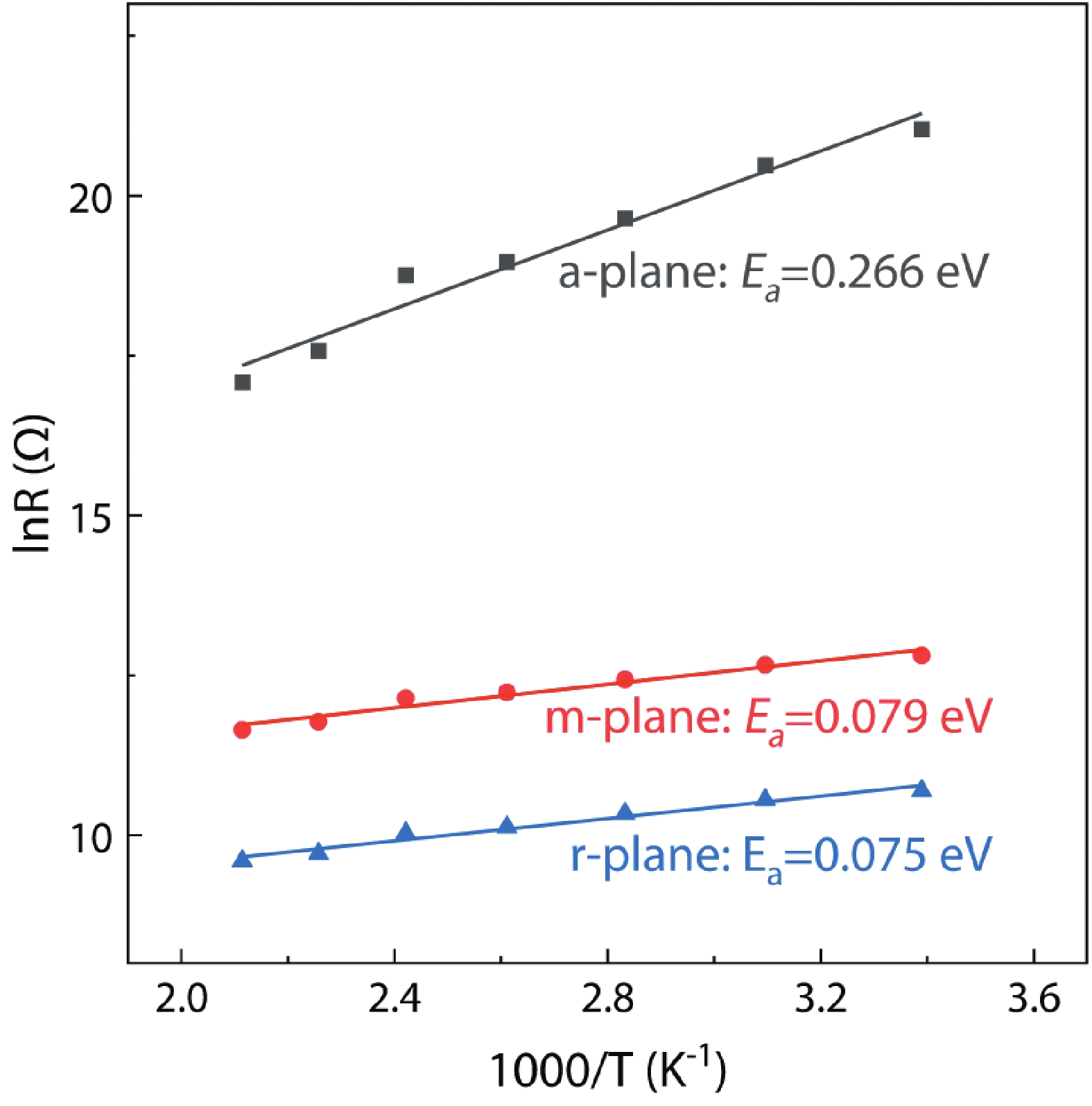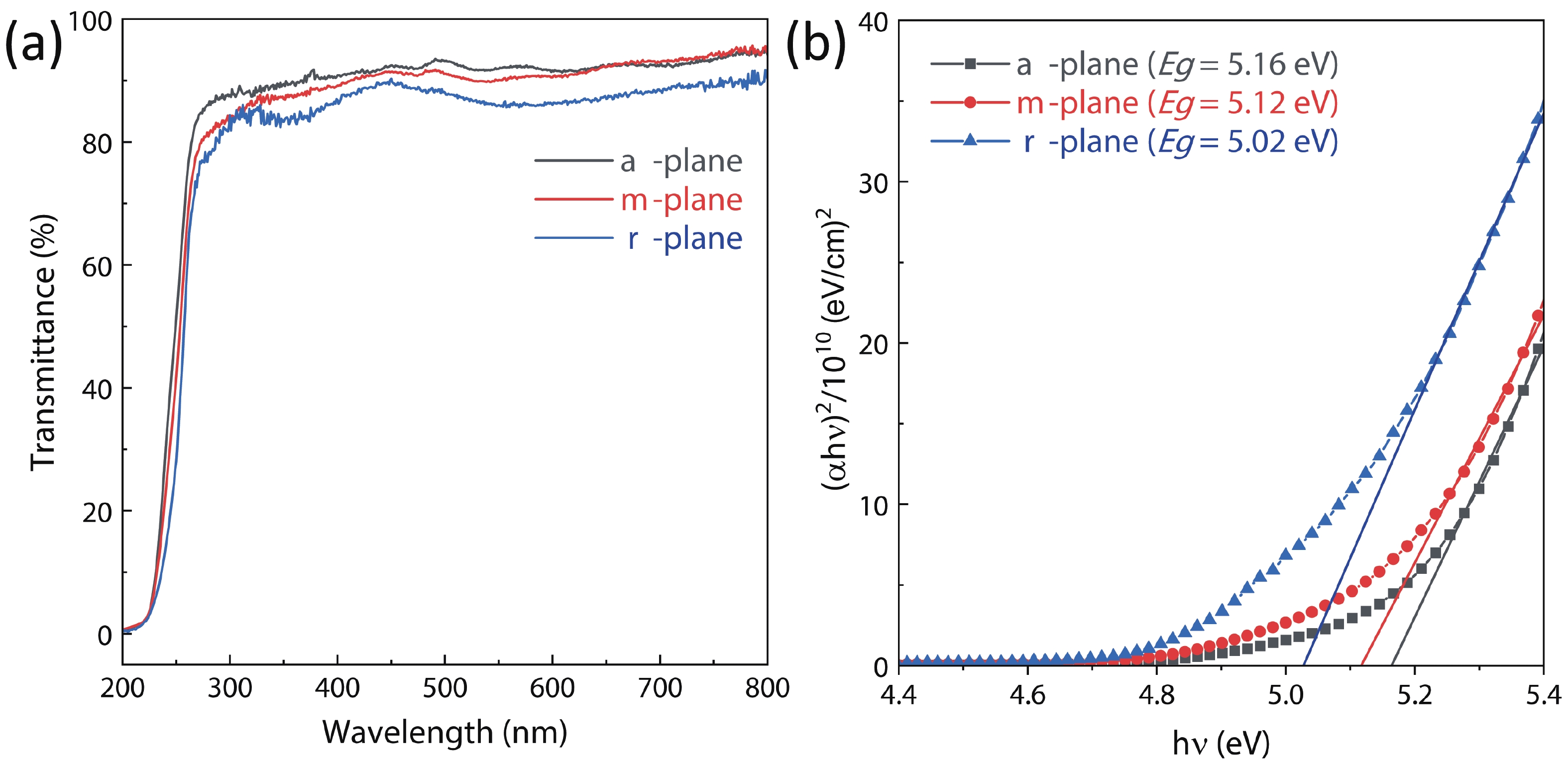 This study explores the epitaxial relationship and electrical properties of α-Ga2O3 thin films deposited on a-plane, m-plane, and r-plane sapphire substrates. We characterize the thin films by X-ray diffraction and Raman spectroscopy, and elucidate thin film epitaxial relationships with the underlying sapphire substrates. The oxygen vacancy concentration of α-Ga2O3 thin films on m-plane and r-plane sapphire substrates are higher than α-Ga2O3 thin film on a-plane sapphire substrates. All three thin films have a high transmission of over 80% in the visible and near-ultraviolet regions, and their optical bandgaps stay around 5.02–5.16 eV. Hall measurements show that the α-Ga2O3 thin film grown on r-plane sapphire has the highest conductivity of 2.71 S/cm, which is at least 90 times higher than the film on a-plane sapphire. A similar orientation-dependence is seen in their activation energy as revealed by temperature-dependent conductivity measurements, with 0.266, 0.079, and 0.075 eV for the film on a-, m-, r-plane, respectively. The origin of the distinct transport behavior of films on differently oriented substrates is suggested to relate with the distinct evolution of oxygen vacancies at differently oriented substrates. This study provides insights for the substrate selection when growing α-Ga2O3 films with tunable transport properties.
