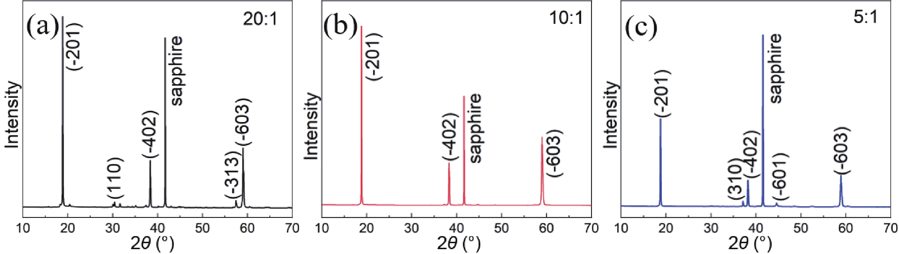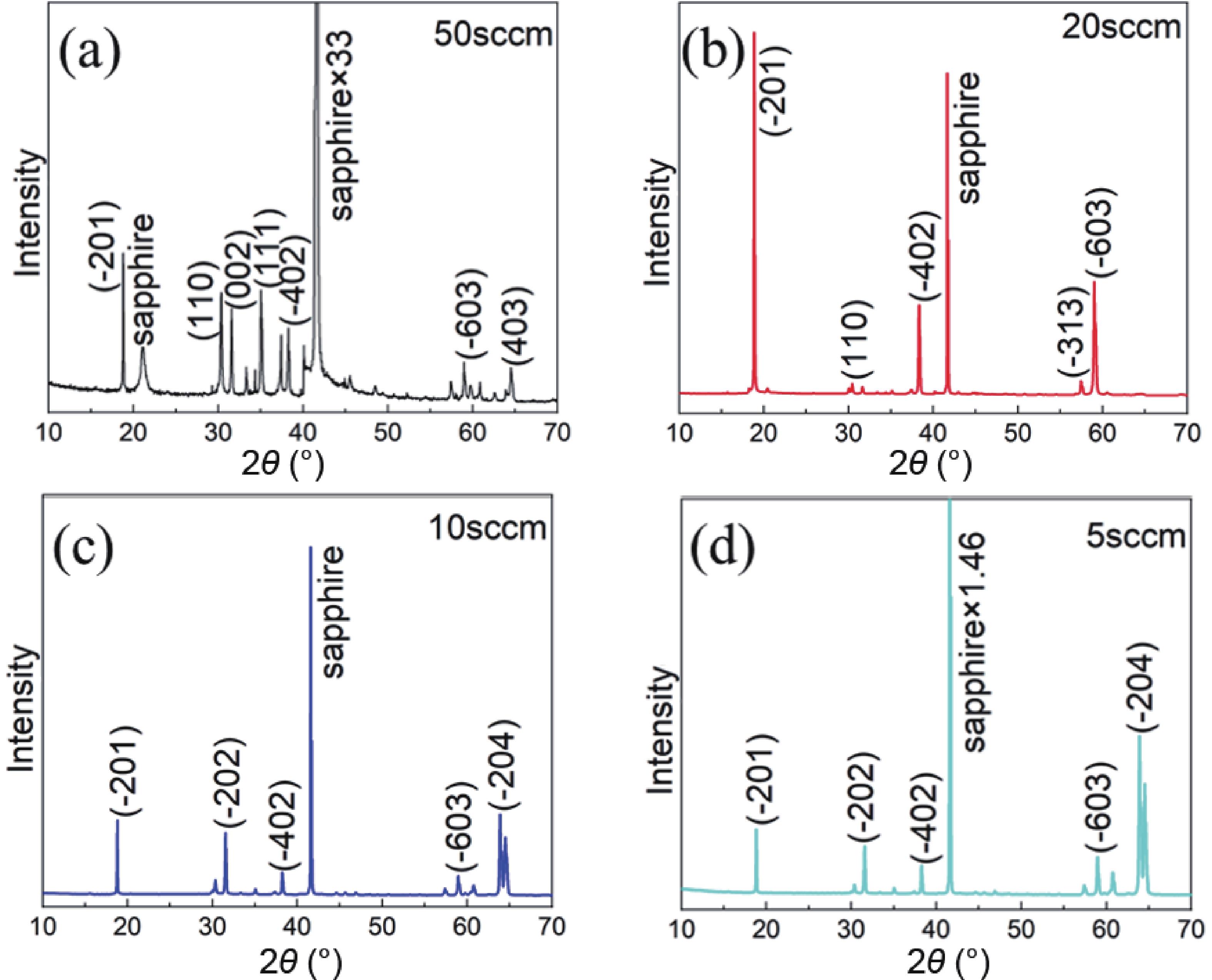 We investigated the influence of the growth temperature, O2 flow, molar ratio between Ga2O3 powder and graphite powder on the structure and morphology of the films grown on the c-plane sapphire (0001) substrates by a carbothermal reduction method. Experimental results for the heteroepitaxial growth of β-Ga2O3 illustrate that β-Ga2O3 growth by the carbothermal reduction method can be controlled. The optimal result was obtained at a growth temperature of 1050 °C. The fastest growth rate of β-Ga2O3 films was produced when the O2 flow was 20 sccm. To guarantee that β-Ga2O3 films with both high-quality crystal and morphology properties, the ideal molar ratio between graphite powder and Ga2O3 powder should be set at 10 : 1.