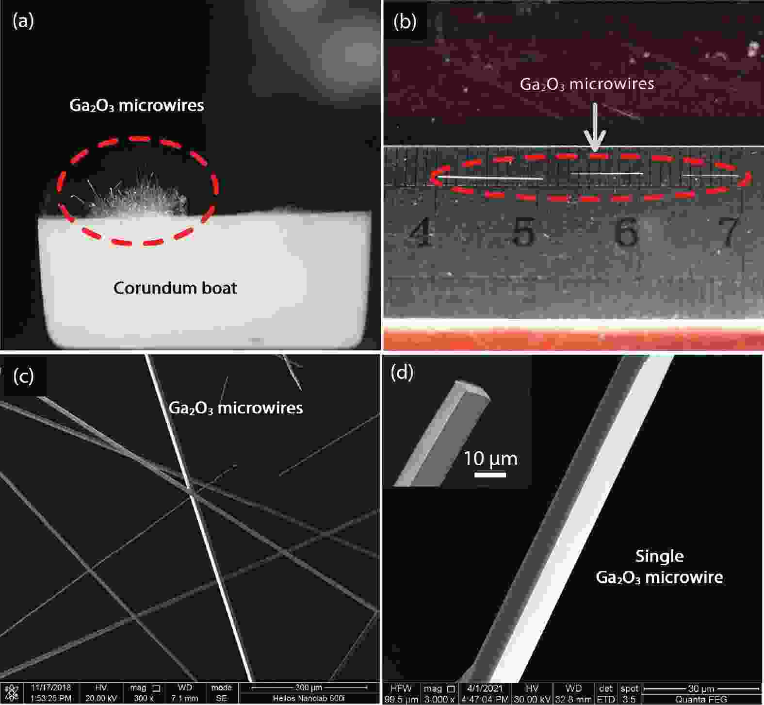 Ultrawide band gap semiconductors are promising solar-blind ultraviolet (UV) photodetector materials due to their suitable bandgap, strong absorption and high sensitivity. Here, β-Ga2O3 microwires with high crystal quality and large size were grown by the chemical vapor deposition (CVD) method. The microwires reach up to 1 cm in length and were single crystalline with low defect density. Owing to its high crystal quality, a metal–semiconductor–metal photodetector fabricated from a Ga2O3 microwire showed a responsivity of 1.2 A/W at 240 nm with an ultrahigh UV/visible rejection ratio (Rpeak/R400 nm) of 5.8 × 105, indicating that the device has excellent spectral selectivity. In addition, no obvious persistent photoconductivity was observed in the test. The rise and decay time constants of the device were 0.13 and 0.14 s, respectively. This work not only provides a growth method for high-quality Ga2O3 microwires, but also demonstrates the excellent performance of Ga2O3 microwires in solar-blind ultraviolet detection.