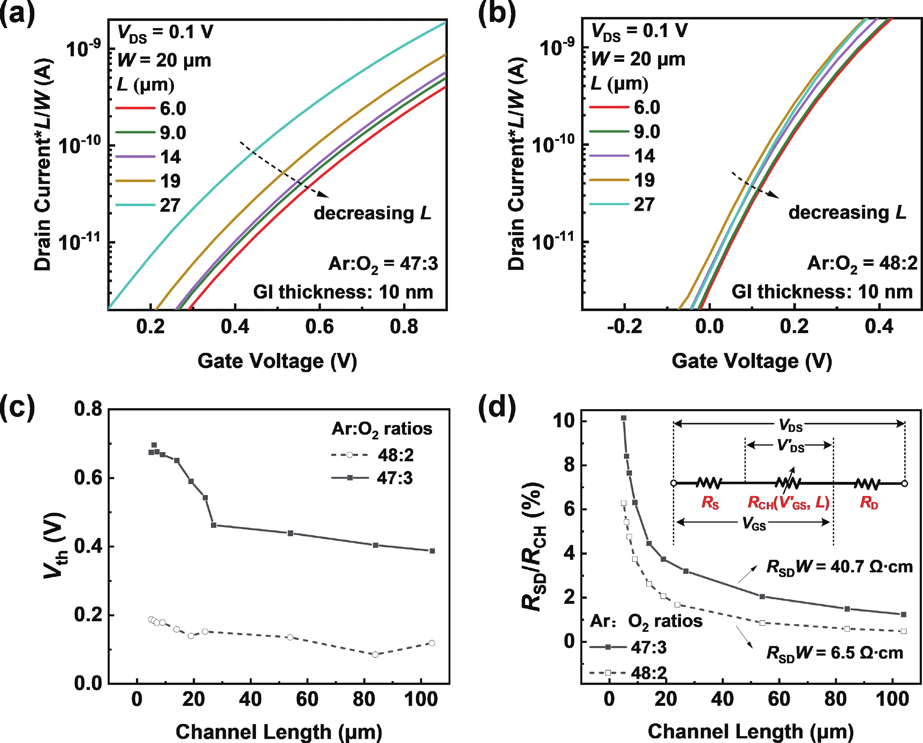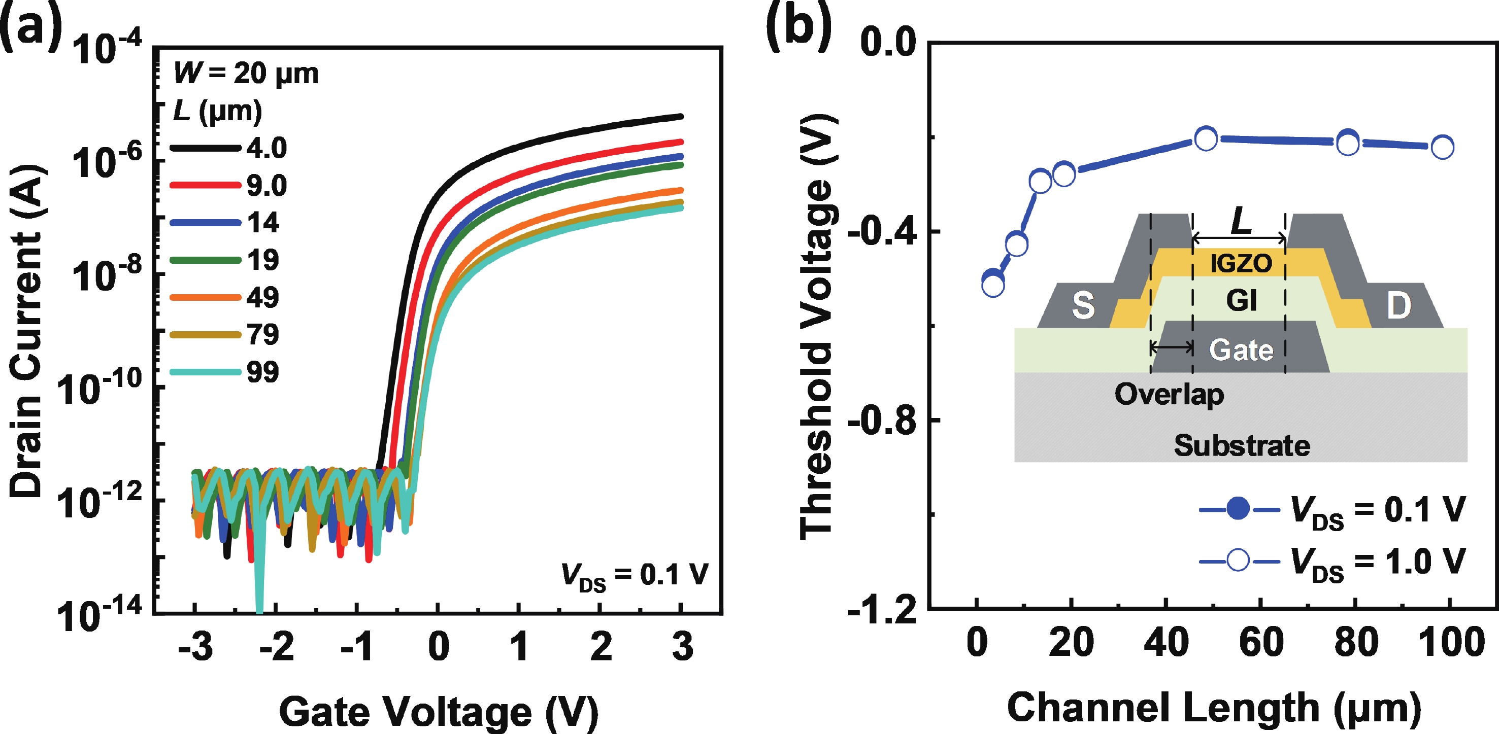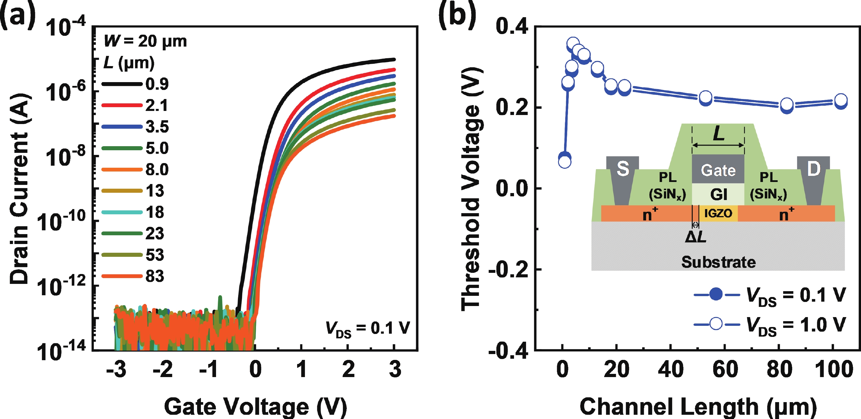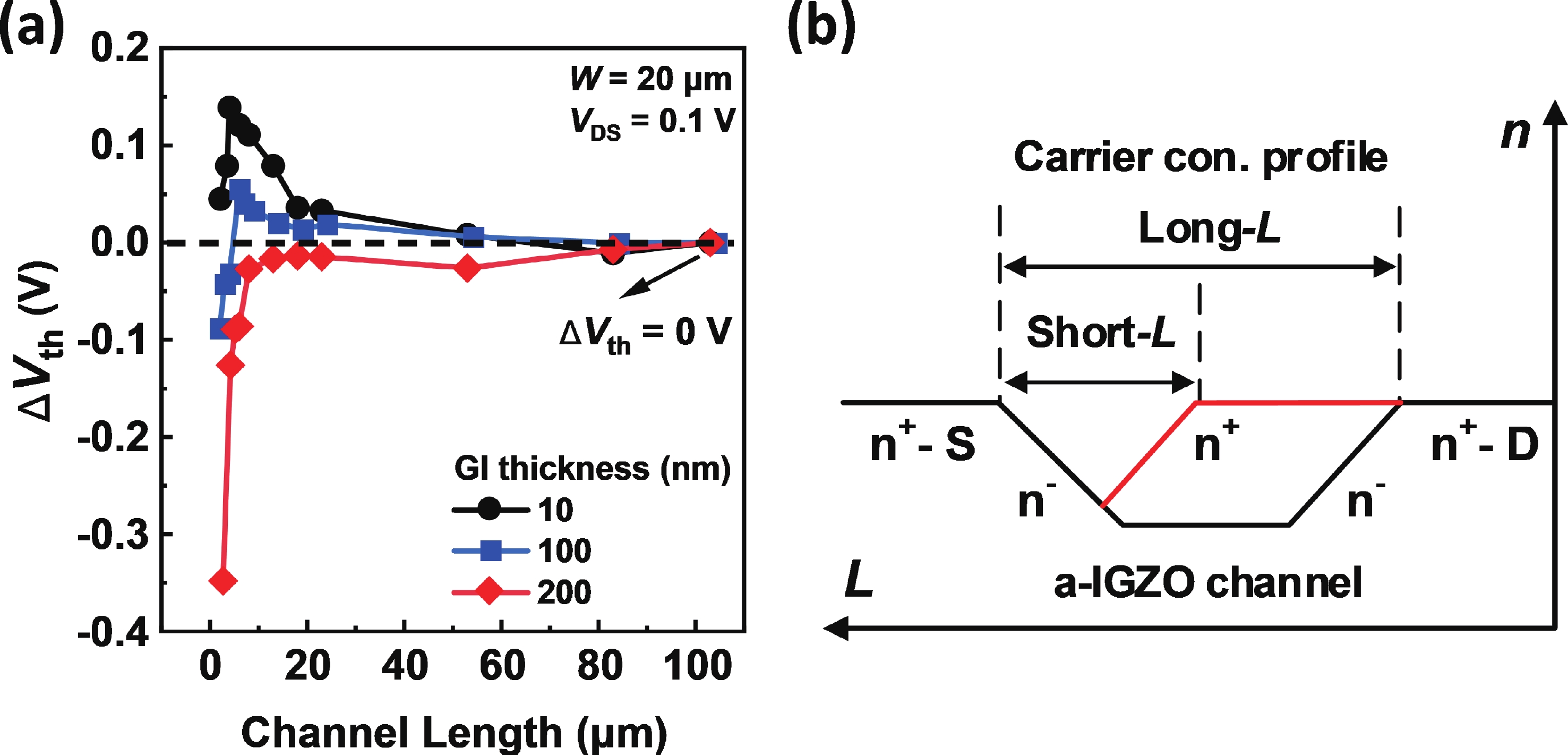 Besides the common short-channel effect (SCE) of threshold voltage (Vth) roll-off during the channel length (L) downscaling of InGaZnO (IGZO) thin-film transistors (TFTs), an opposite Vth roll-up was reported in this work. Both roll-off and roll-up effects of Vth were comparatively investigated on IGZO transistors with varied gate insulator (GI), source/drain (S/D), and device architecture. For IGZO transistors with thinner GI, the SCE was attenuated due to the enhanced gate controllability over the variation of channel carrier concentration, while the Vth roll-up became more noteworthy. The latter was found to depend on the relative ratio of S/D series resistance (RSD) over channel resistance (RCH), as verified on transistors with different S/D. Thus, an ideal S/D engineering with small RSD but weak dopant diffusion is highly expected during the downscaling of L and GI in IGZO transistors.
