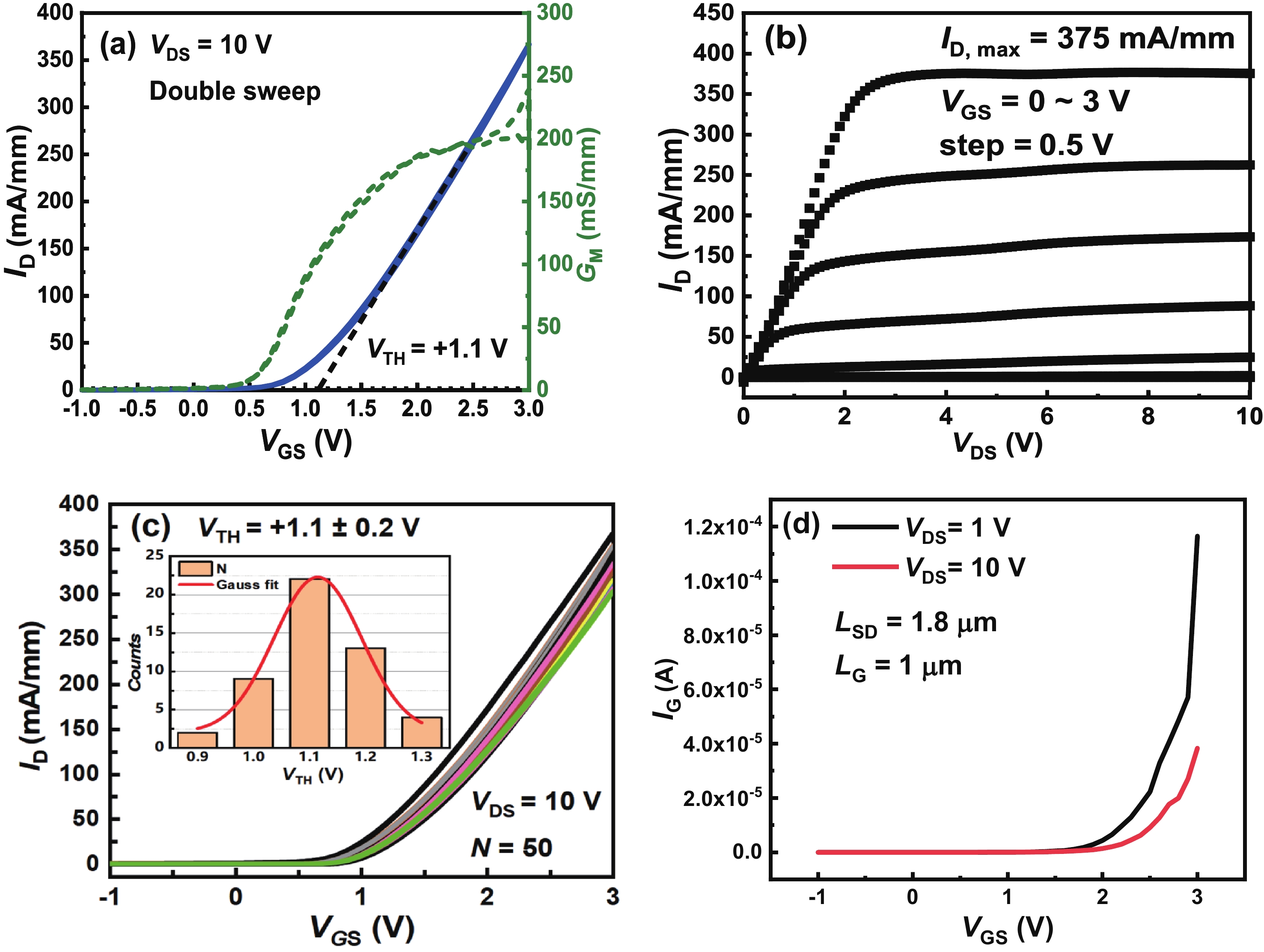 Abstract: Enhancement-mode (E-mode) GaN-on-Si radio-frequency (RF) high-electron-mobility transistors (HEMTs) were fabricated on an ultrathin-barrier (UTB) AlGaN (<6 nm)/GaN heterostructure featuring a naturally depleted 2-D electron gas (2DEG) channel. The fabricated E-mode HEMTs exhibit a relatively high threshold voltage (VTH) of +1.1 V with good uniformity. A maximum current/power gain cut-off frequency (fT/fMAX) of 31.3/99.6 GHz with a power added efficiency (PAE) of 52.47% and an output power density (Pout) of 1.0 W/mm at 3.5 GHz were achieved on the fabricated E-mode HEMTs with 1-μm gate and Au-free ohmic contact.