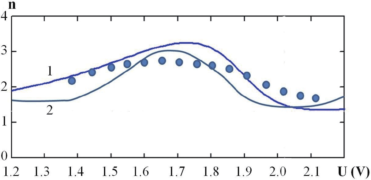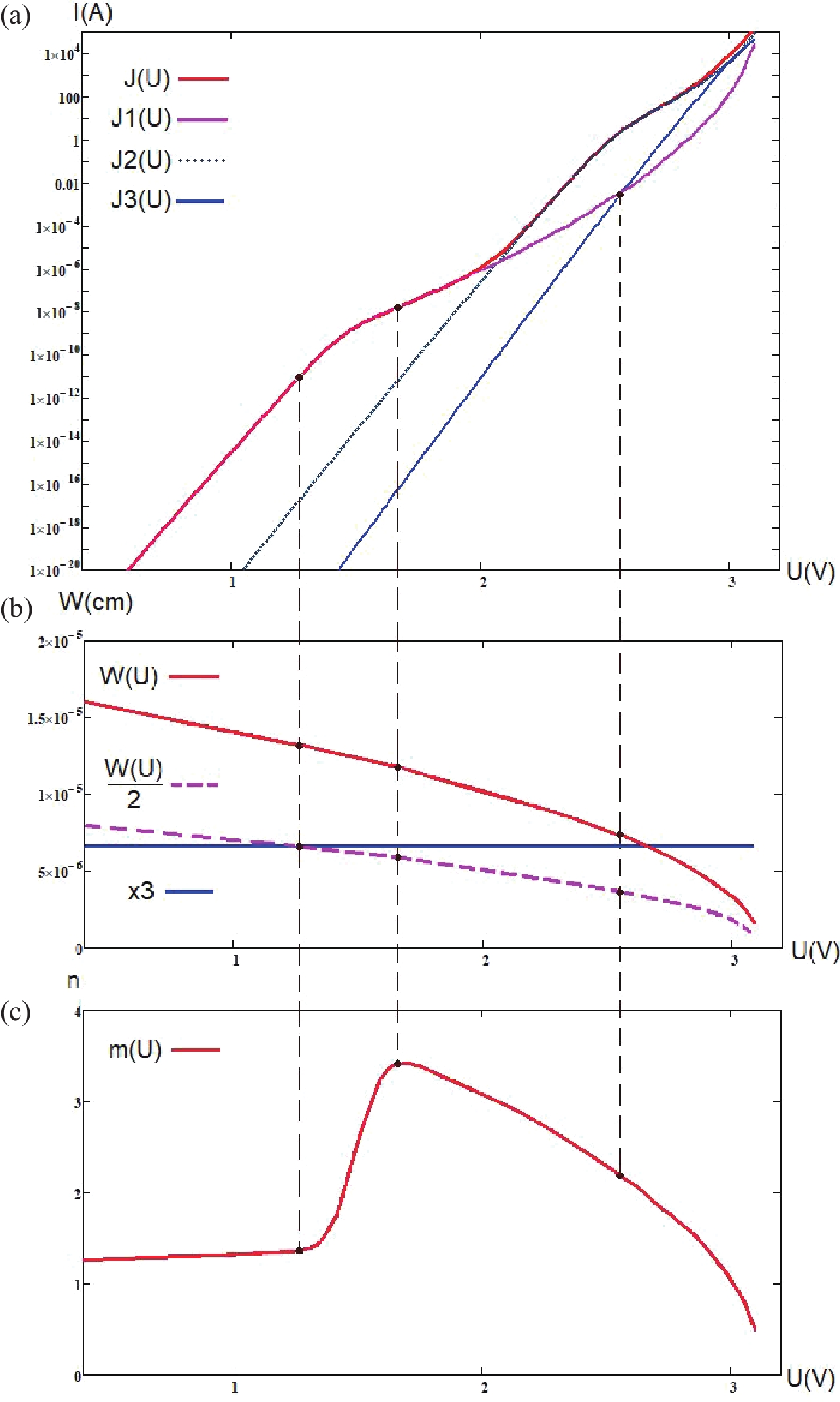 Abstract: Herein, a physical and mathematical model of the voltage?current characteristics of a p?n heterostructure with quantum wells (QWs) is prepared using the Sah?Noyce?Shockley (SNS) recombination mechanism to show the SNS recombination rate of the correction function of the distribution of QWs in the space charge region of diode configuration. A comparison of the model voltage?current characteristics (VCCs) with the experimental ones reveals their adequacy. The technological parameters of the structure of the VCC model are determined experimentally using a nondestructive capacitive approach for determining the impurity distribution profile in the active region of the diode structure with a profile depth resolution of up to 10 ?. The correction function in the expression of the recombination rate shows the possibility of determining the derivative of the VCCs of structures with QWs with a nonideality factor of up to 4.