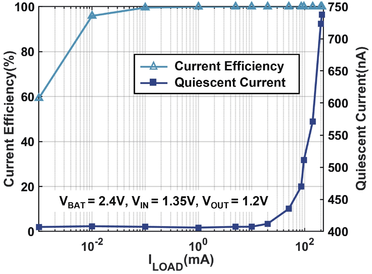 | FoM = TRECOVERY·(ΔVOUT/VOUT)·(IQ/ΔILOAD)[22]. a: IQ = 160 nA is utilized for FoM calculation, as the transient response performance for this FoM is at 1 mA ILOAD where IQ is 160 nA. |