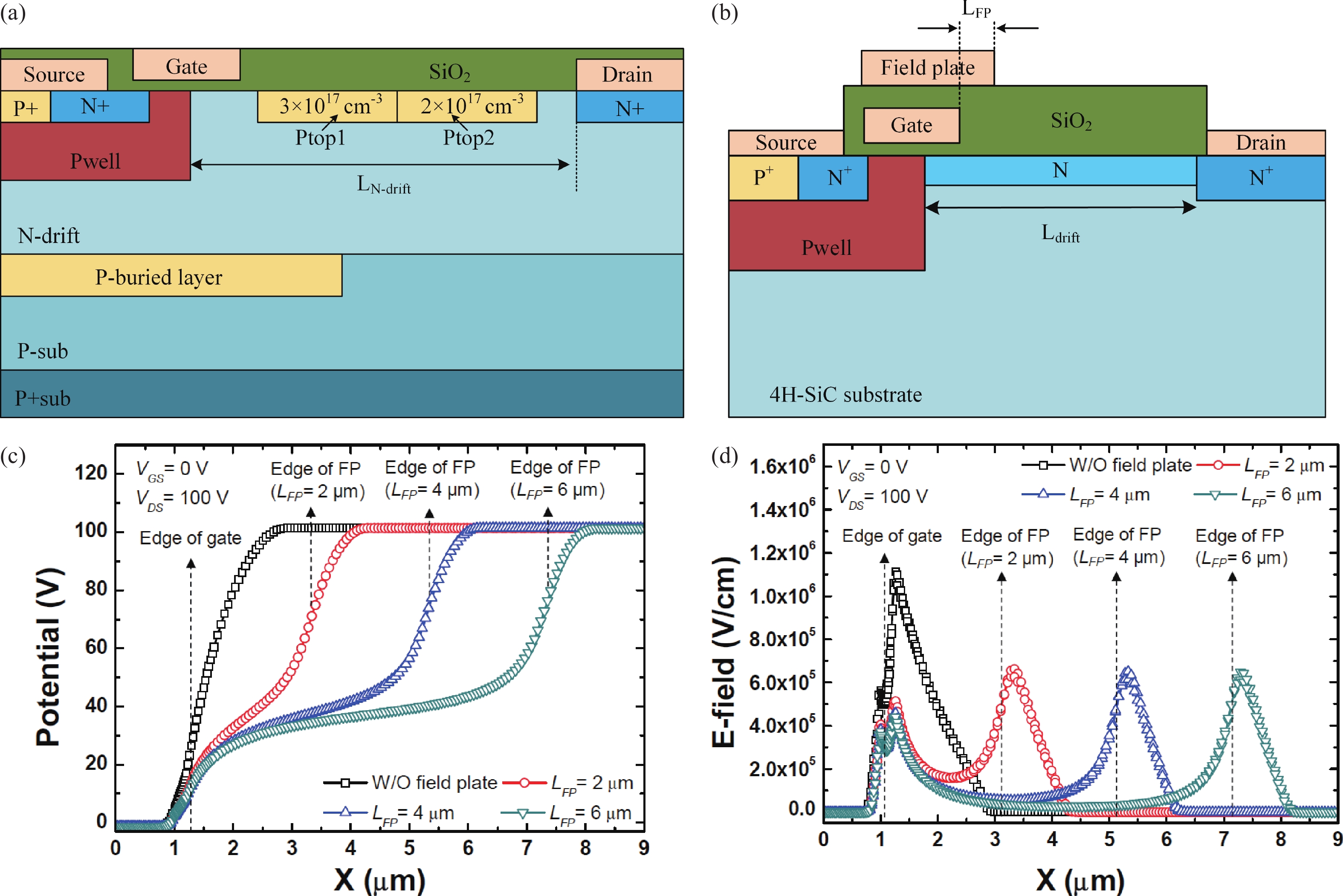 | 4H-SiC LDMOS with gate field plates | / | 59.75 | 934 | 14.6 | 19 mA/mm (Vgs = 25 V) |