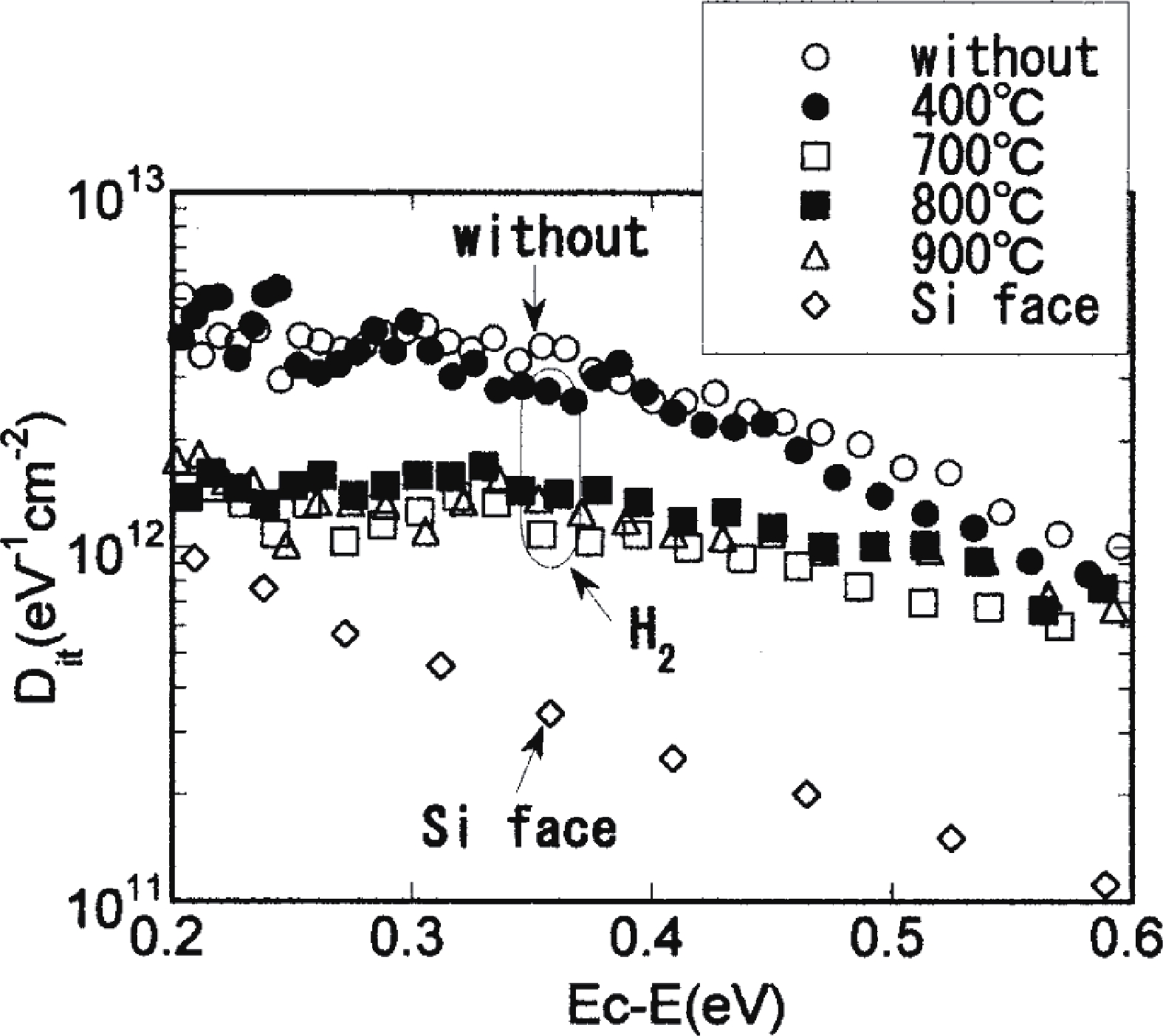 Fukuda K, Cho W J, Arai K, et al. Effect of oxidation method and post-oxidation annealing on interface properties of metal–oxide–semiconductor structures formed on n-type 4H-SiC C(0001?) face. Appl Phys Lett, 2000, 77(6), 866 doi: 10.1063/1.1306649