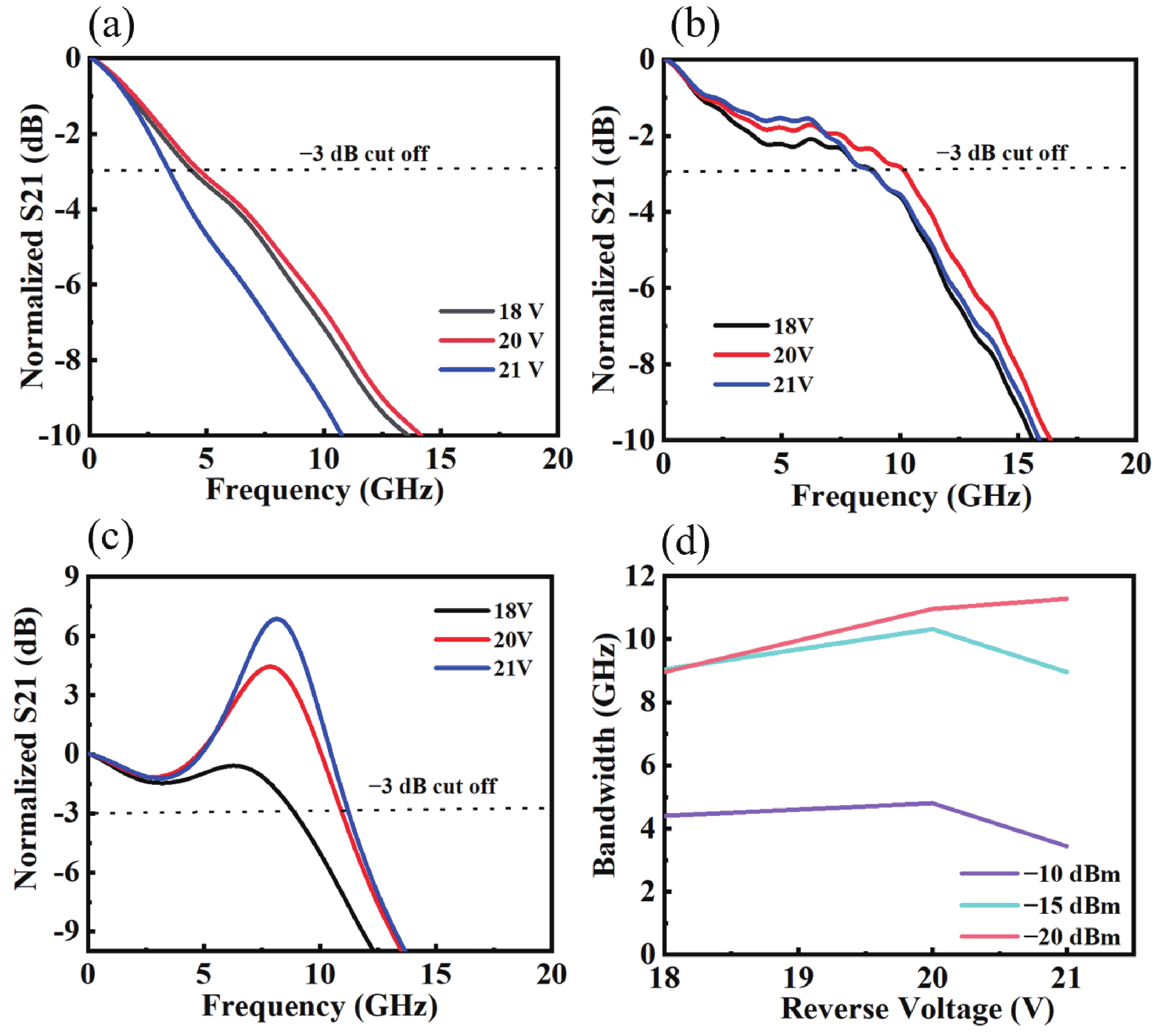 Abstract: Avalanche photodetectors (APDs) featuring an avalanche multiplication region are vital for reaching high sensitivity and responsivity in optical transceivers. Waveguide-coupled Ge-on-Si separate absorption, charge, and multiplication (SACM) APDs are popular due to their straightforward fabrication process, low optical propagation loss, and high detection sensitivity in optical communications. This paper introduces a lateral SACM Ge-on-Si APD on a silicon-on-insulator (SOI) wafer, featuring a 10 μm-long, 0.5 μm-wide Ge layer at 1310 nm on a standard 8-inch silicon photonics platform. The dark current measures approximately 38.6 μA at ?21 V, indicating a breakdown voltage greater than ?21 V for the device. The APDs exhibit a unit-gain responsivity of 0.5 A/W at ?10 V. At ?15 V, their responsivity reaches 2.98 and 2.91 A/W with input powers of ?10 and ?25 dBm, respectively. The device's 3-dB bandwidth is 15 GHz with an input power of ?15 dBm and a gain is 11.68. Experimental results show a peak in impedance at high bias voltages, attributed to inductor and capacitor (LC) circuit resonance, enhancing frequency response. Furthermore, 20 Gbps eye diagrams at ?21 V and ?9 dBm input power reveal signal to noise ratio (SNRs) of 5.30. This lateral SACM APD, compatible with the stand complementary metal oxide semiconductor (CMOS) process, shows that utilizing the peaking effect at low optical power increases bandwidth.