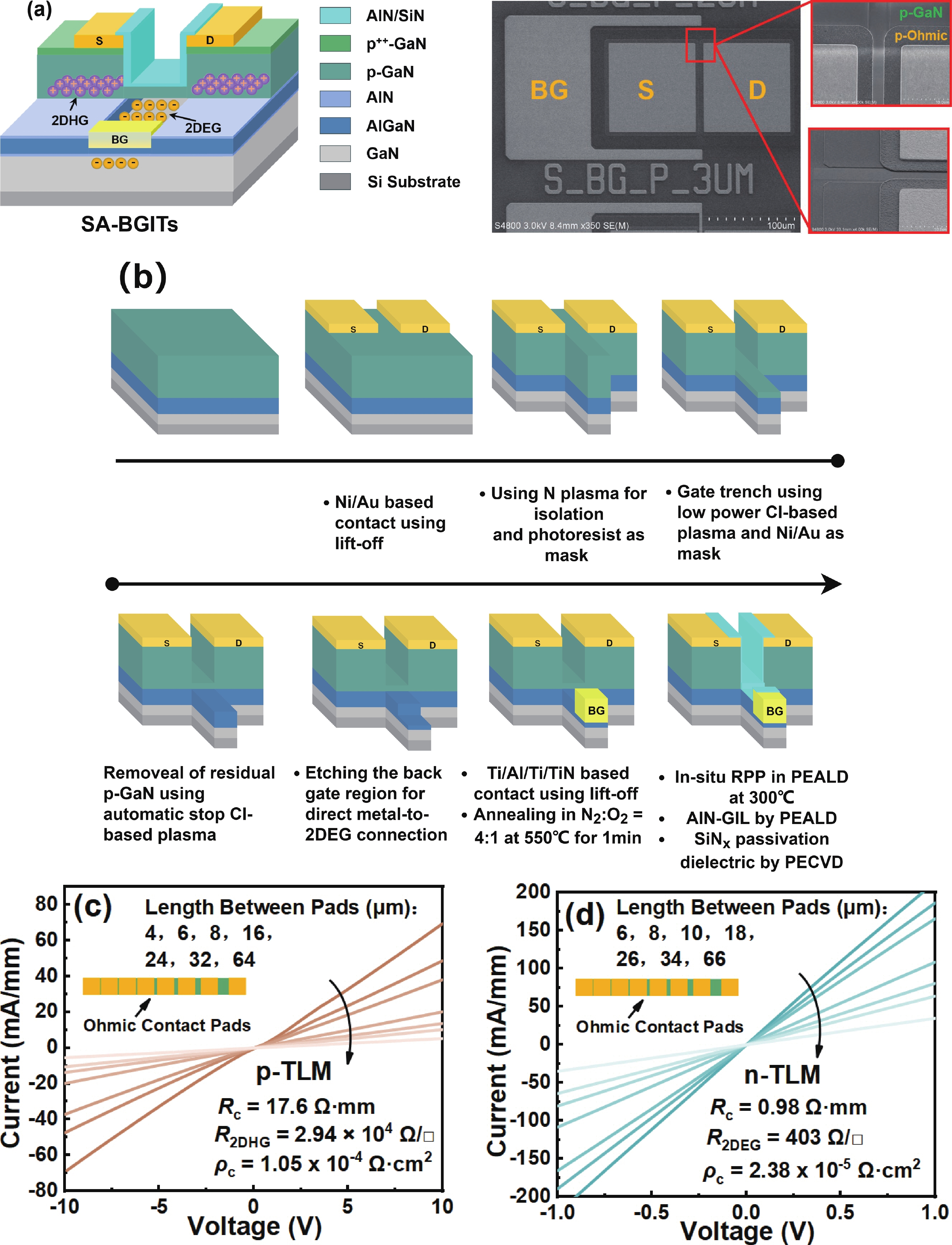 Abstract: In this study, we present the development of self-aligned p-channel GaN back gate injection transistors (SA-BGITs) that exhibit a high ON-state current. This achievement is primarily attributed to the conductivity modulation effect of the 2-D electron gas (2DEG, the back gate) beneath the 2-D hole gas (2DHG) channel. SA-BGITs with a gate length of 1 μm have achieved an impressive peak drain current (ID,MAX) of 9.9 mA/mm. The fabricated SA-BGITs also possess a threshold voltage of 0.15 V, an exceptionally minimal threshold hysteresis of 0.2 V, a high switching ratio of 107, and a reduced ON-resistance (RON) of 548 Ω·mm. Additionally, the SA-BGITs exhibit a steep sub-threshold swing (SS) of 173 mV/dec, further highlighting their suitability for integration into GaN logic circuits.