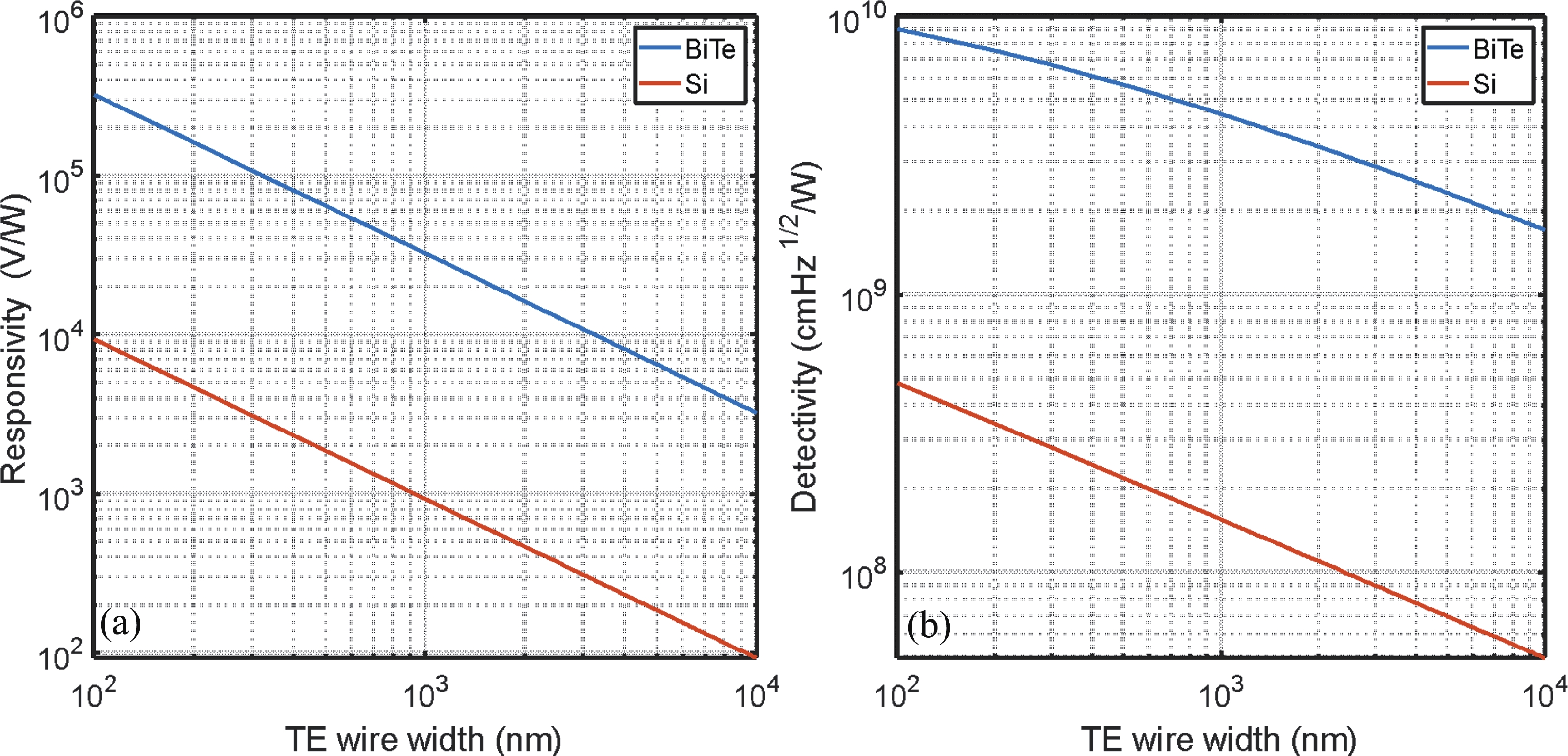 | Material | Detectivity—conventional design (cm·Hz1/2/W) | Detectivity—optimized design (cm·Hz1/2/W) |