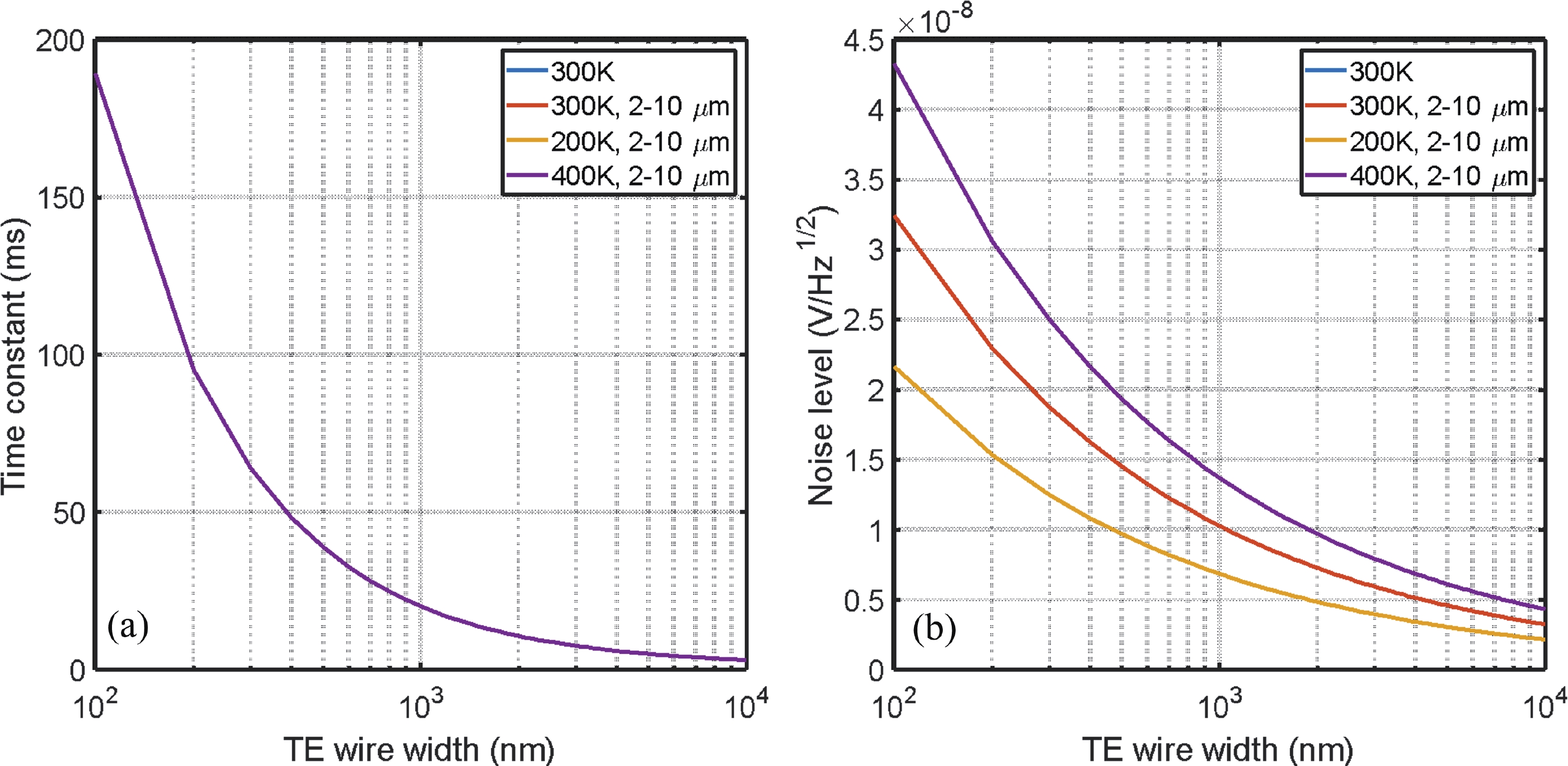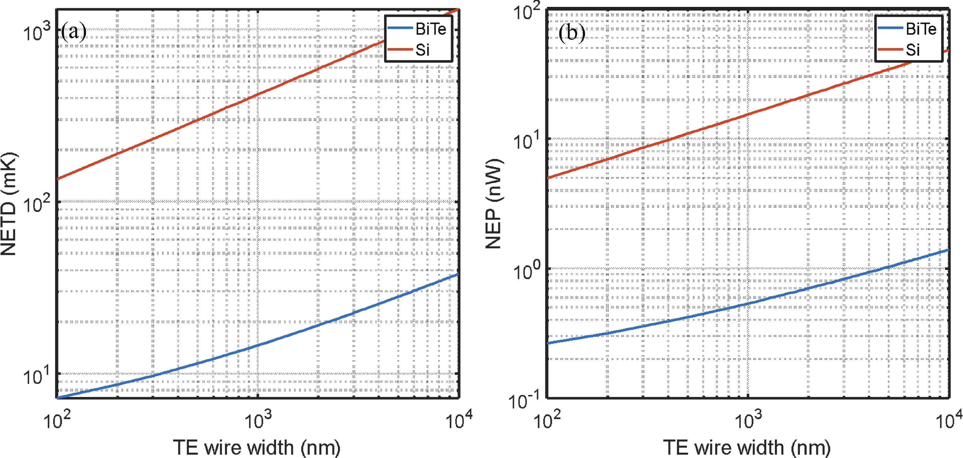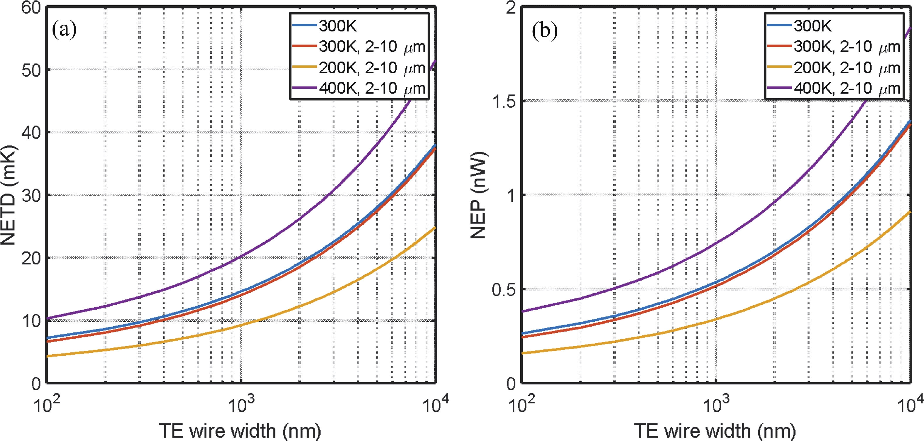 Abstract: This study presents a comprehensive optimization and comparative analysis of thermoelectric (TE) infrared (IR) detectors using Bi2Te3 and Si materials. Through theoretical modeling and numerical simulations, we explored the impact of TE material properties, device structure, and operating conditions on responsivity, detectivity, noise equivalent temperature difference (NETD), and noise equivalent power (NEP). Our study offers an optimally designed IR detector with responsivity and detectivity approaching 2 × 105 V/W and 6 × 109 cm?Hz1/2/W, respectively. This enhancement is attributed to unique design features, including raised thermal collectors and long suspended thin thermoelectric wire sensing elements embedded in low thermal conductivity organic materials like parylene. Moreover, we demonstrate the compatibility of Bi2Te3-based detector fabrication processes with existing MEMS foundry processes, facilitating scalability and manufacturability. Importantly, for TE IR detectors, zT/κ emerges as a critical parameter contrary to conventional TE material selection based solely on zT (where zT is the thermoelectric figure of merit and κ is the thermal conductivity).