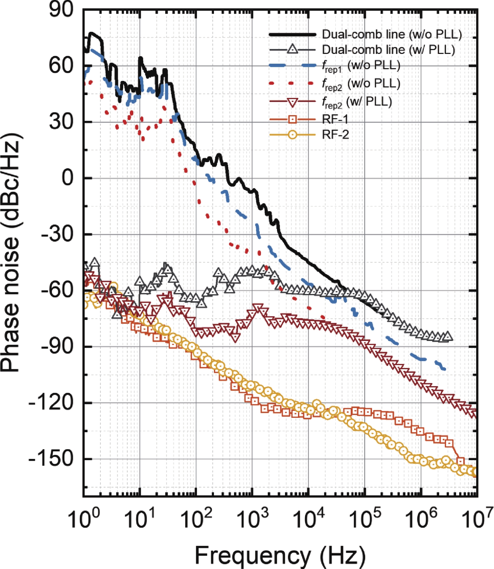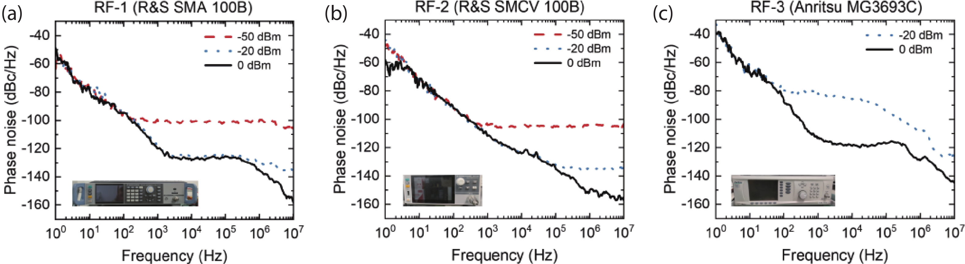 | Offset frequency (Hz) | Phase noise of RF-1 (dBc/Hz) | Phase noise of RF-2 (dBc/Hz) | Phase noise of RF-3 (dBc/Hz) |