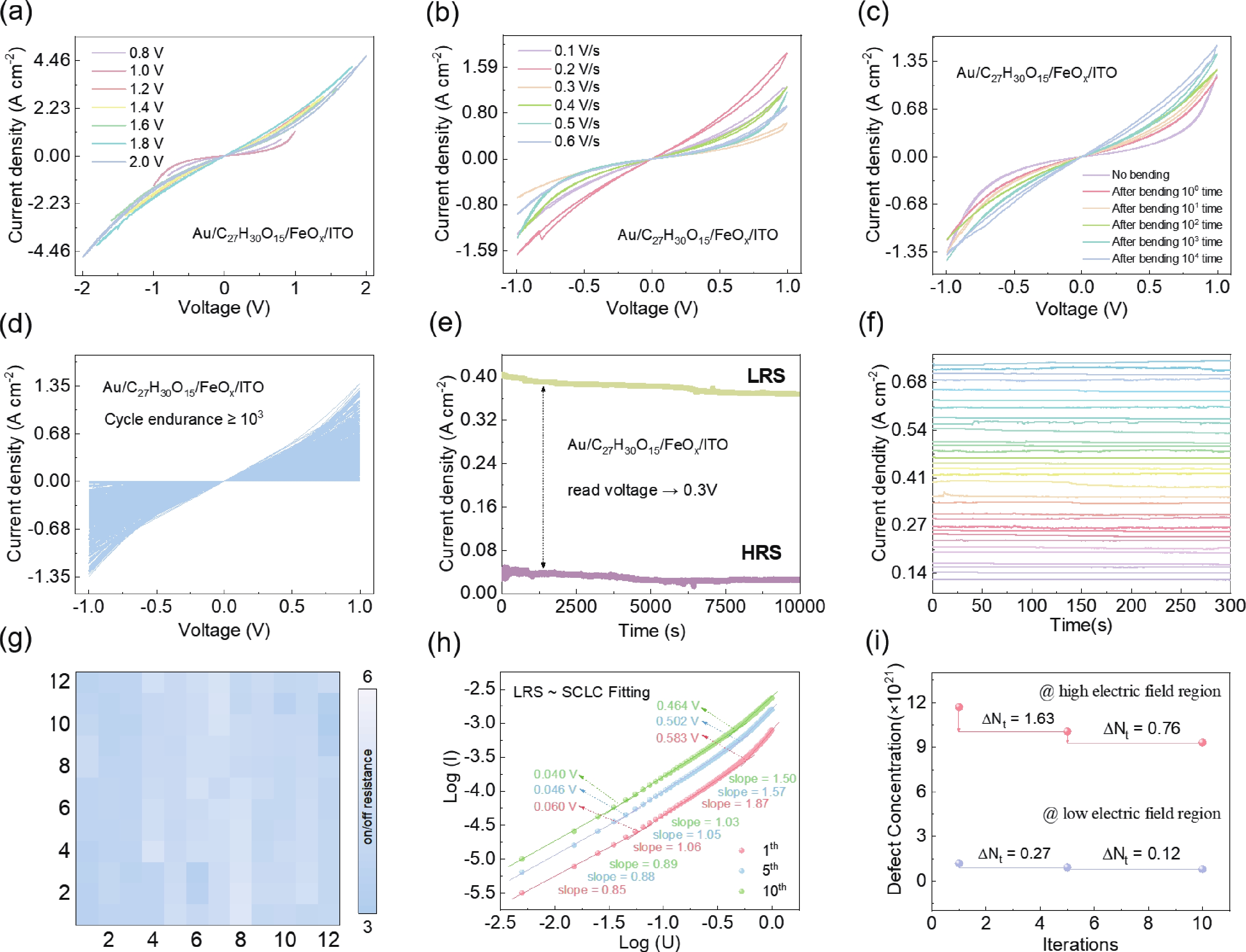 Abstract: With the advancement of artificial intelligence, optic in-sensing reservoir computing based on emerging semiconductor devices is high desirable for real-time analog signal processing. Here, we disclose a flexible optomemristor based on C27H30O15/FeOx heterostructure that presents a highly sensitive to the light stimuli and artificial optic synaptic features such as short- and long-term plasticity (STP and LTP), enabling the developed optomemristor to implement complex analogy signal processing through building a real-physical dynamic-based in-sensing reservoir computing algorithm and yielding an accuracy of 94.88% for speech recognition. The charge trapping and detrapping mediated by the optic active layer of C27H30O15 that is extracted from the lotus flower is response for the positive photoconductance memory in the prepared optomemristor. This work provides a feasible organic?inorganic heterostructure as well as an optic in-sensing vision computing for an advanced optic computing system in future complex signal processing.