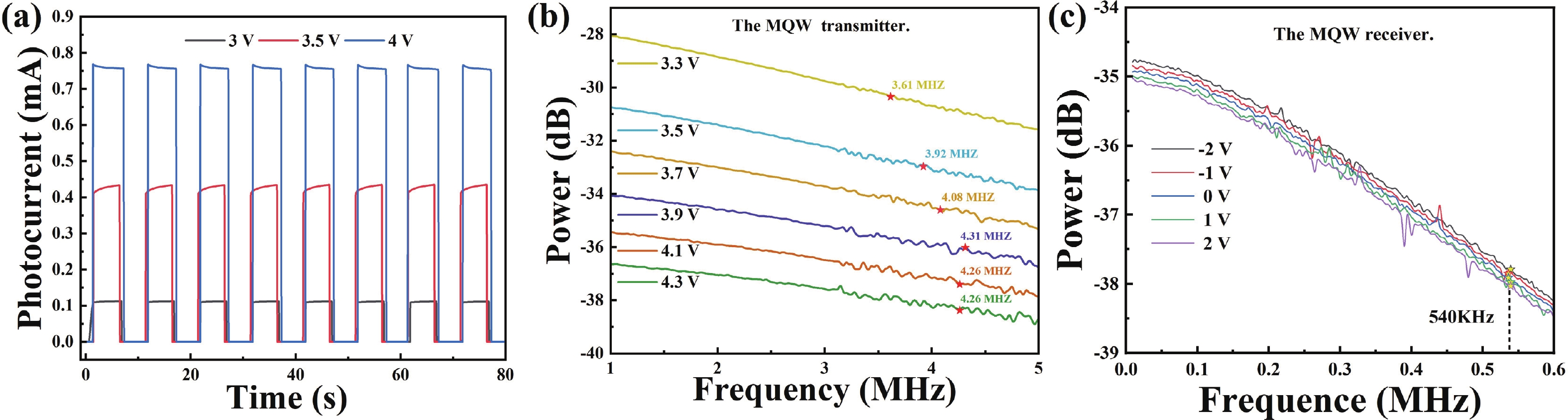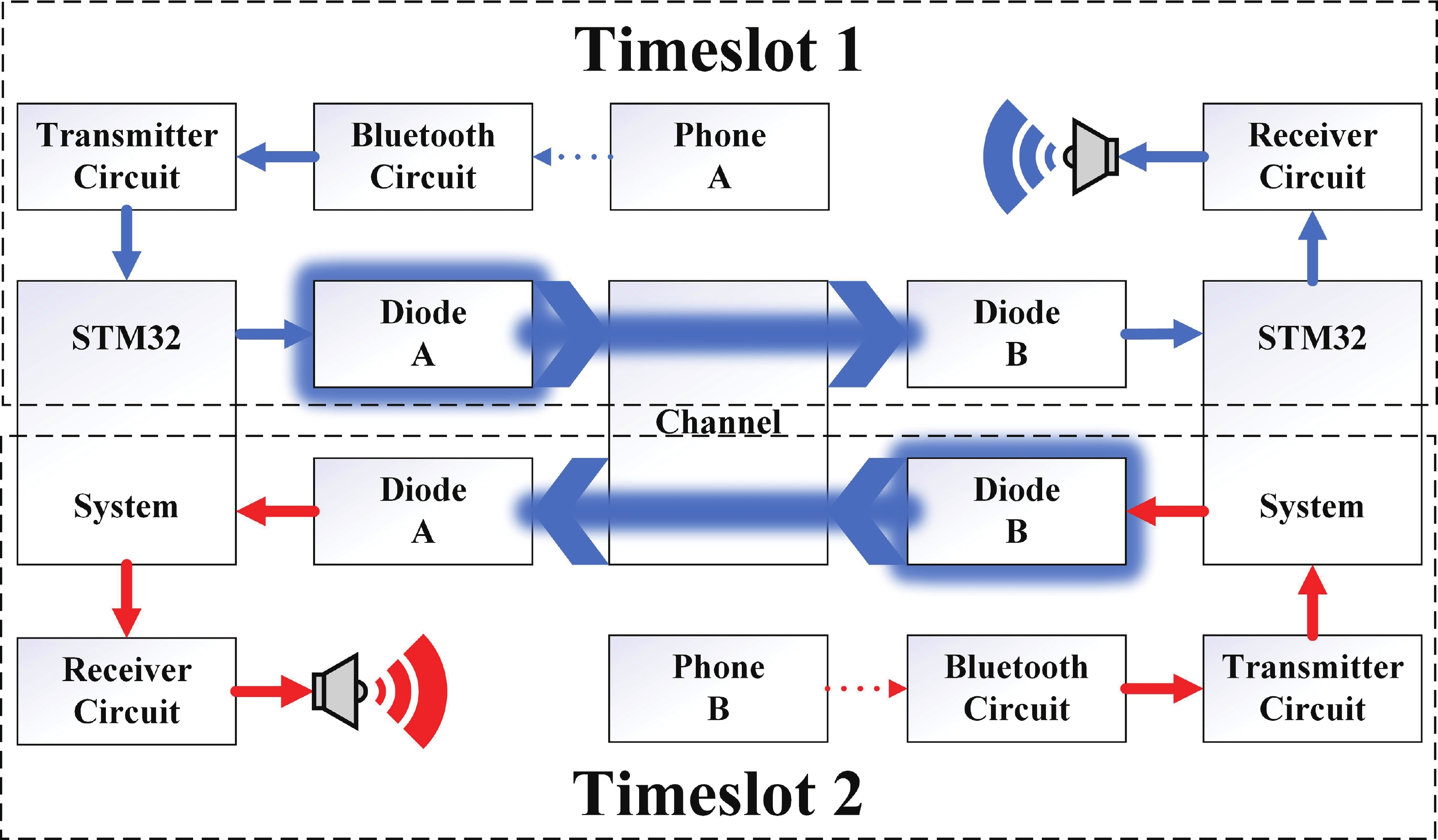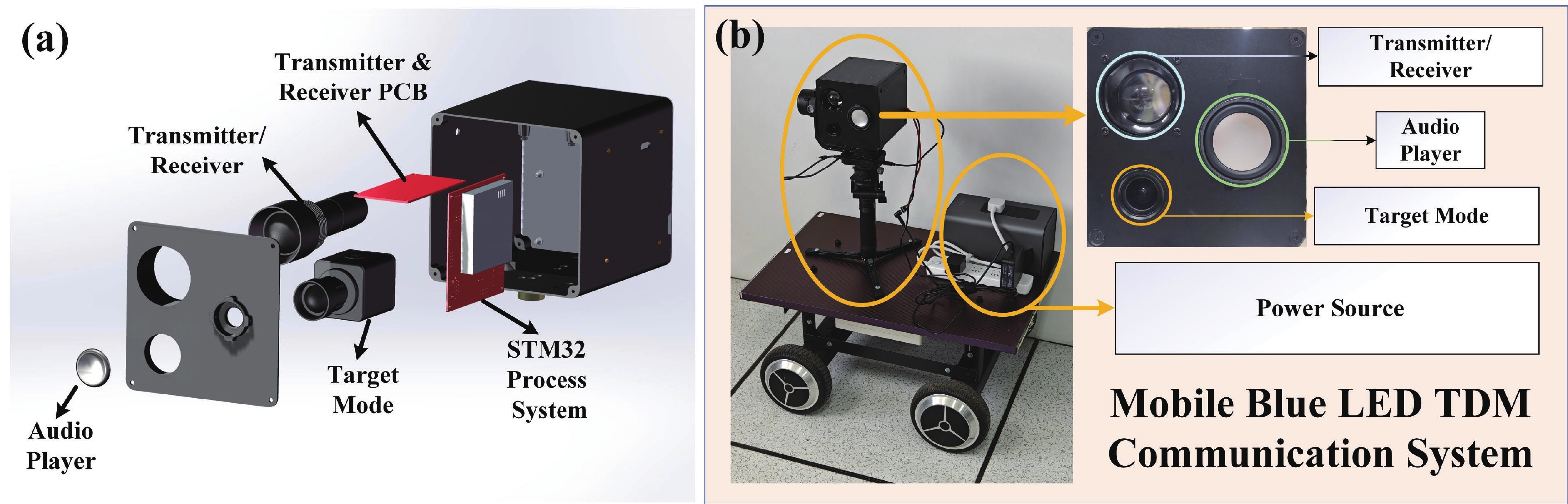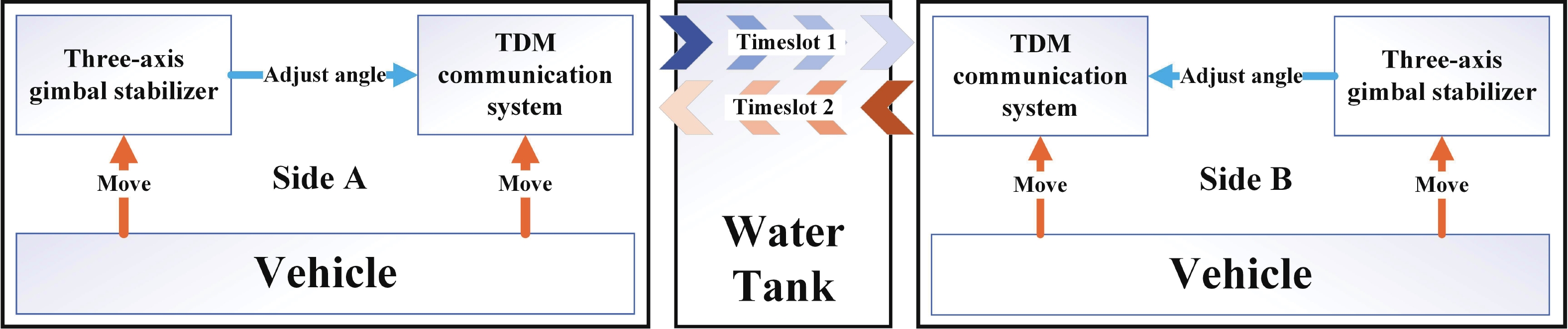 Abstract: Multiple quantum well (MQW) Ⅲ-nitride diodes that can simultaneously emit and detect light feature an overlapping region between their electroluminescence and responsivity spectra, which allows them to be simultaneously used as both a transmitter and a receiver in a wireless light communication system. Here, we demonstrate a mobile light communication system using a time-division multiplexing (TDM) scheme to achieve bidirectional data transmission via the same optical channel. Two identical blue MQW diodes are defined by software as a transmitter or a receiver. To address the light alignment issue, an image identification module integrated with a gimbal stabilizer is used to automatically detect the locations of moving targets; thus, underwater audio communication is realized via a mobile blue-light TDM communication mode. This approach not only uses a single link but also integrates mobile nodes in a practical network.