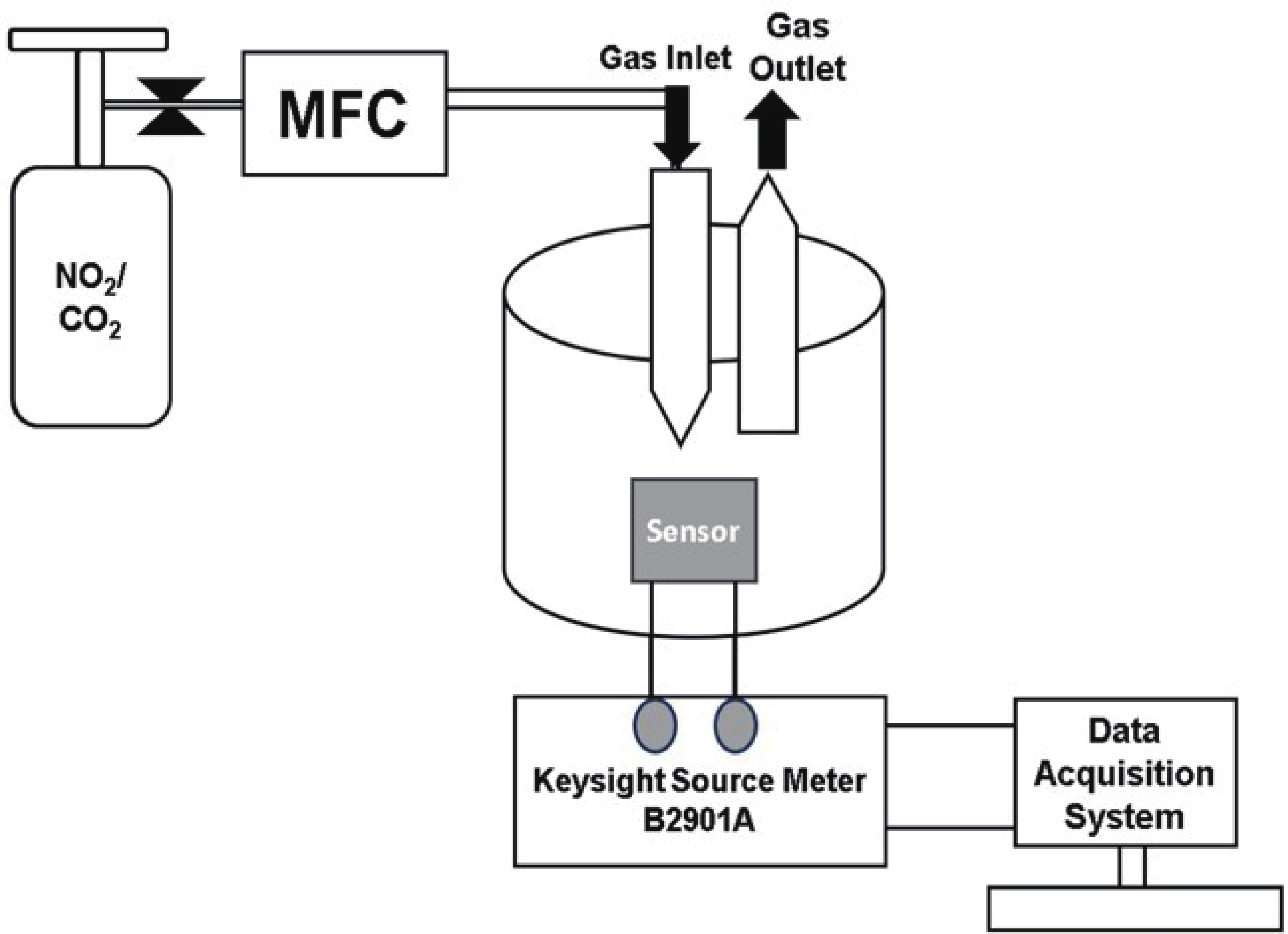 Abstract: The rapid industrial growth and increasing population have led to significant pollution and deterioration of the natural atmospheric environment. Major atmospheric pollutants include NO2 and CO2. Hence, it is imperative to develop NO2 and CO2 sensors for ambient conditions, that can be used in indoor air quality monitoring, breath analysis, food spoilage detection, etc. In the present study, two thin film nanocomposite (nickel oxide-graphene and nickel oxide-silver nanowires) gas sensors are fabricated using direct ink writing. The nano-composites are investigated for their structural, optical, and electrical properties. Later the nano-composite is deposited on the interdigitated electrode (IDE) pattern to form NO2 and CO2 sensors. The deposited films are then exposed to NO2 and CO2 gases separately and their response and recovery times are determined using a custom-built gas sensing setup. Nickel oxide-graphene provides a good response time and recovery time of 10 and 9 s, respectively for NO2, due to the higher electron affinity of graphene towards NO2. Nickel oxide-silver nanowire nano-composite is suited for CO2 gas because silver is an excellent electrocatalyst for CO2 by giving response and recovery times of 11 s each. This is the first report showcasing NiO nano-composites for NO2 and CO2 sensing at room temperature.