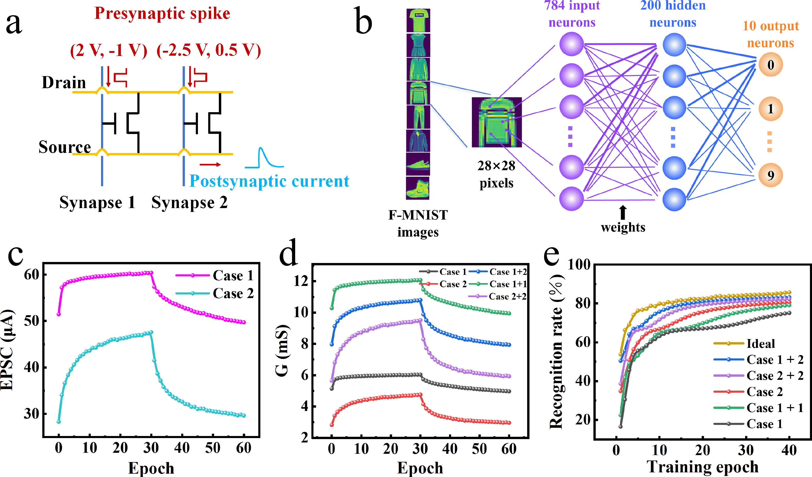 Abstract: We demonstrate a bipolar graphene/F16CuPc synaptic transistor (GFST) with matched p-type and n-type bipolar properties, which emulates multiplexed neurotransmission of the release of two excitatory neurotransmitters in graphene and F16CuPc channels, separately. This process facilitates fast-switching plasticity by altering charge carriers in the separated channels. The complementary neural network for image recognition of Fashion-MNIST dataset was constructed using the matched relative amplitude and plasticity properties of the GFST dominated by holes or electrons to improve the weight regulation and recognition accuracy, achieving a pattern recognition accuracy of 83.23%. These results provide new insights to the construction of future neuromorphic systems.