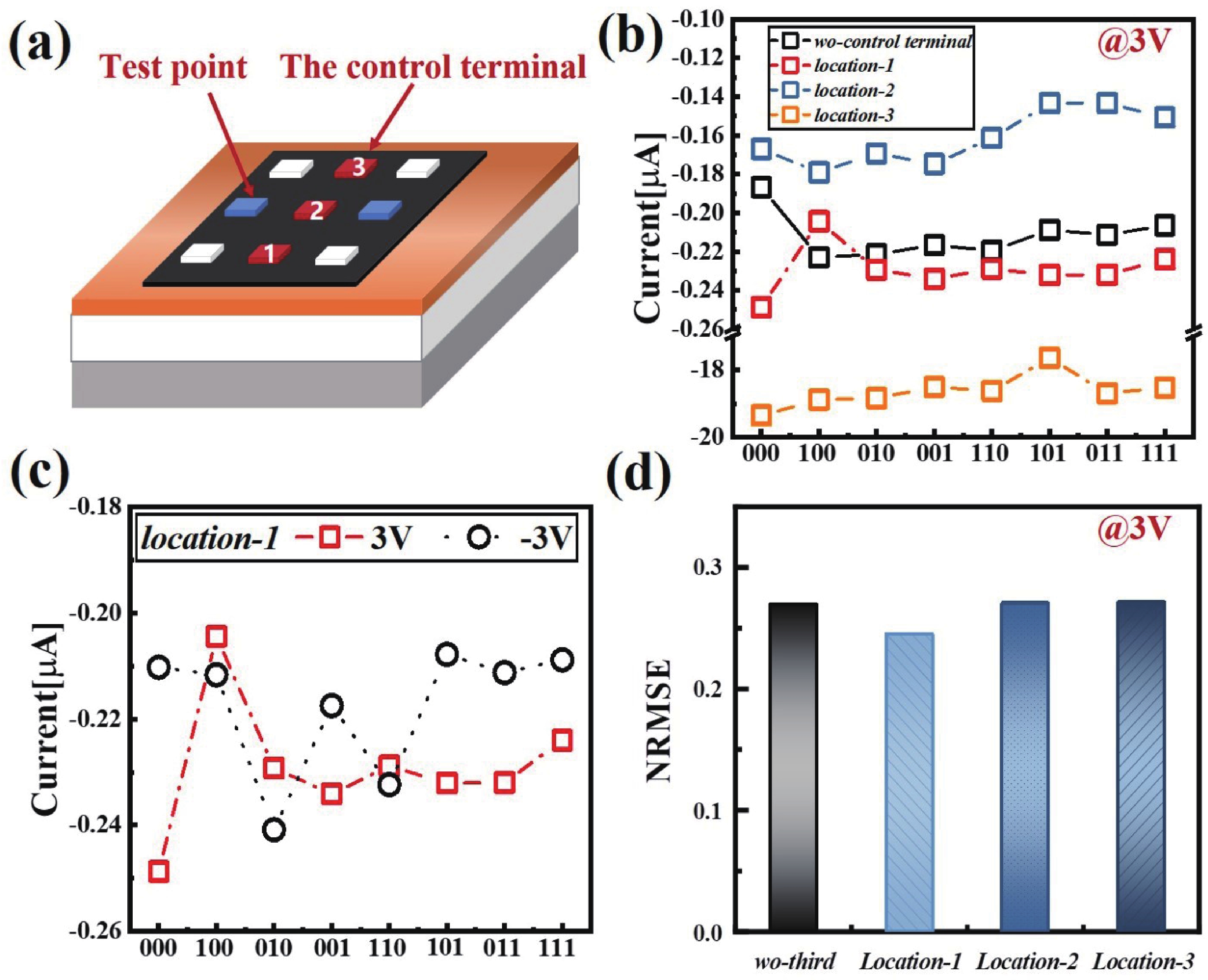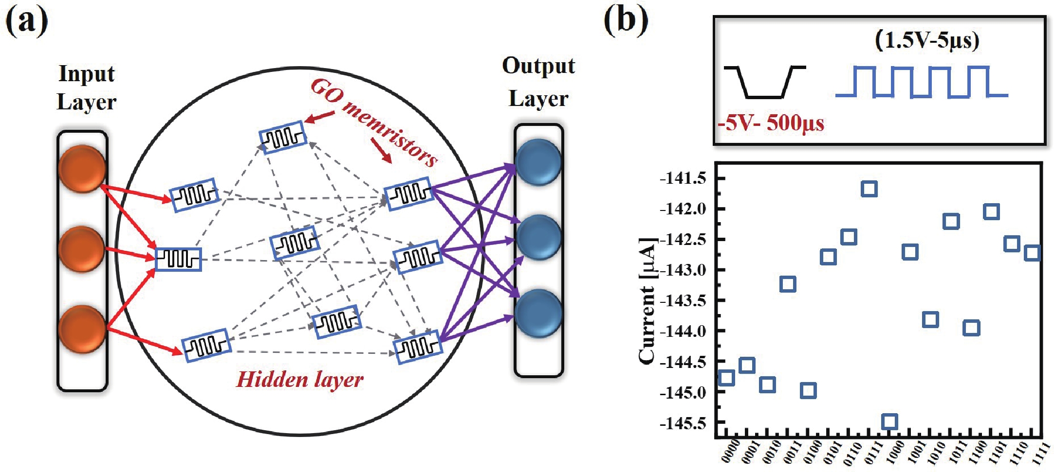 Abstract: Graphene oxide, as a 2D material with nanometer thickness, offers ultra-high mobility, chaotic properties, and low cost. These make graphene oxide memristors beneficial for reservoir computing (RC) networks. In this study, continuous-wave (CW) laser processing is used to reduce chaotic graphene oxide (CGO) films, resulting in the non-volatile storage capability based on the reduced chaotic graphene oxide (rCGO) films. Laser power significantly impacts the characteristics of the rCGO memristor. Material characterization indicates that laser radiation can effectively reduce the oxygen content in CGO films. With optimized laser power, the rCGO memristor achieves a large ratio at 18 mW laser power. Benefiting from the short-term memory characteristics, distinct conductive states are achieved, which are further utilized to construct RC networks. With a third control probe, the rCGO memristor can express rich reservoir states, demonstrating accuracy in predicting the Hénon map with an NRMSE below 0.3. These findings provide the potential for developing flexible RC networks based on graphene oxide memristors via laser processing.