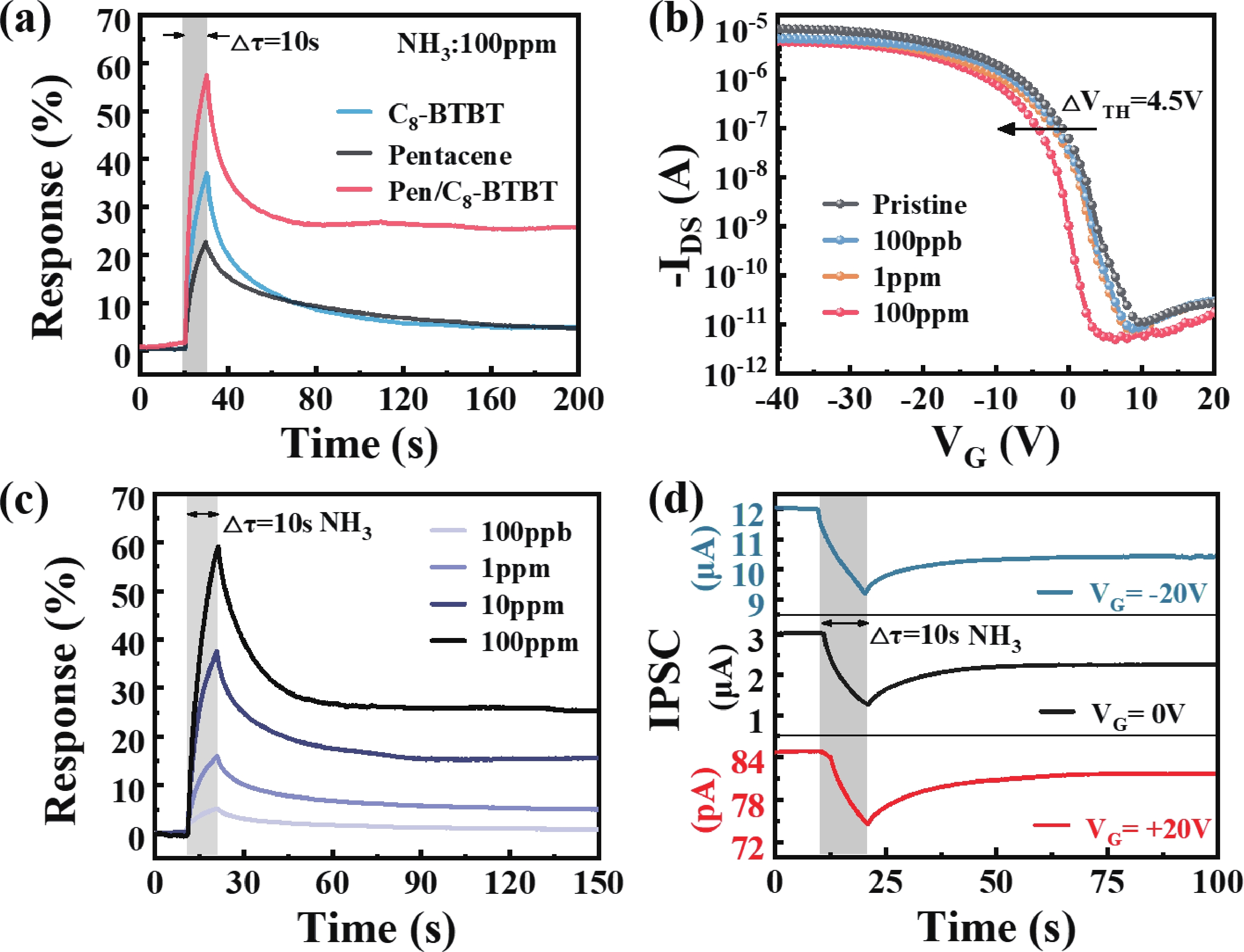 Abstract: Simulating the human olfactory nervous system is one of the key issues in the field of neuromorphic computing. Olfactory neurons interact with gas molecules, transmitting and storing odor information to the olfactory center of the brain. In order to emulate the complex functionalities of olfactory neurons, this study presents a flexible olfactory synapse transistor (OST) based on pentacene/C8-BTBT organic heterojunction. By modulating the interface between the energy bands of the organic semiconductor layers, this device demonstrates high sensitivity (ppb level) and memory function for NH3 sensing. Typical synaptic behaviors triggered by NH3 pulses have been successfully demonstrated, such as inhibitory postsynaptic currents (IPSC), paired-pulse depression (PPD), long-term potentiation/depression (LTP/LTD), and transition from short-term depression (STD) to long-term depression (LTD). Furthermore, this device maintains stable olfactory synaptic functions even under different bending conditions, which can present new insights and possibilities for flexible synaptic systems and bio-inspired electronic products.