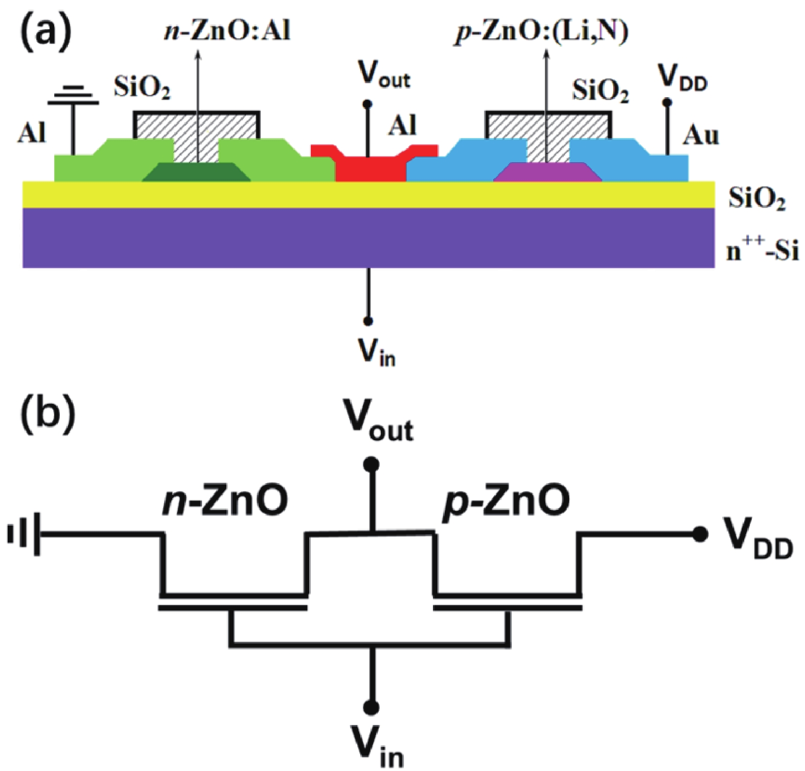 Abstract: Complementary inverter is the basic unit for logic circuits, but the inverters based on full oxide thin-film transistors (TFTs) are still very limited. The next challenge is to realize complementary inverters using homogeneous oxide semiconductors. Herein, we propose the design of complementary inverter based on full ZnO TFTs. Li?N dual-doped ZnO (ZnO:(Li,N)) acts as the p-type channel and Al-doped ZnO (ZnO:Al) serves as the n-type channel for fabrication of TFTs, and then the complementary inverter is produced with p- and n-type ZnO TFTs. The homogeneous ZnO-based complementary inverter has typical voltage transfer characteristics with the voltage gain of 13.34 at the supply voltage of 40 V. This work may open the door for the development of oxide complementary inverters for logic circuits.