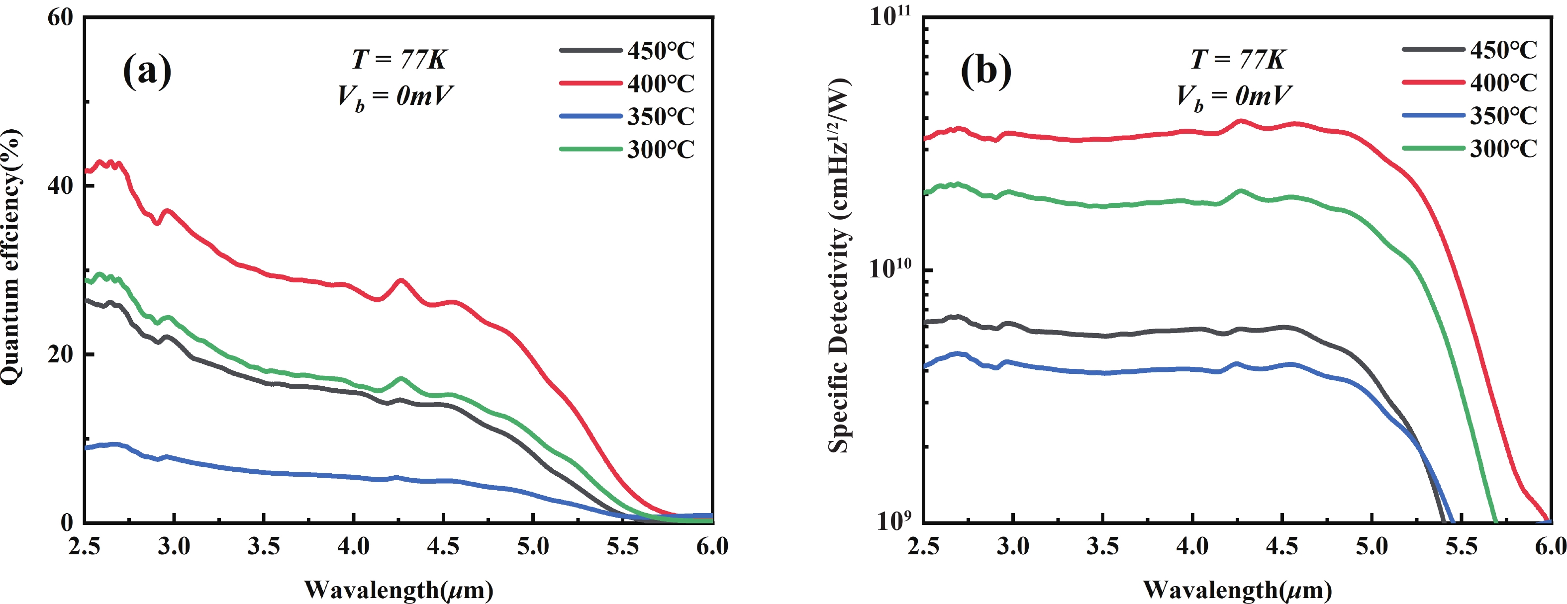 Abstract: In this paper, a planar junction mid-wavelength infrared (MWIR) photodetector based on an InAs/GaSb type-Ⅱ superlattices (T2SLs) is reported. The Intrinsic-πMN superlattices was grown by the molecular beam epitaxy (MBE), followed with a ZnS layer grown by the chemical vapor deposition (CVD). The p-type contact layer was constructed by thermal diffusion in the undoped superlattices. The Zinc atom was successfully realised into the superlattice and a PπMN T2SL structure was constructed. Furthermore, the effects of different diffusion temperatures on the dark current performance of the devices were researched. The 50% cut-off wavelength of the photodetector is 5.26 μm at 77 K with 0 V bias. The minimum dark current density is 8.67 × 10?5 A/cm2 and the maximum quantum efficiency of 42.5%, and the maximum detectivity reaches 3.90 × 1010 cm·Hz1/2/W at 77 K. The 640 × 512 focal plane arrays (FPA) based on the planner junction were fabricated afterwards. The FPA achieves a noise equivalent temperature difference (NETD) of 539 mK.