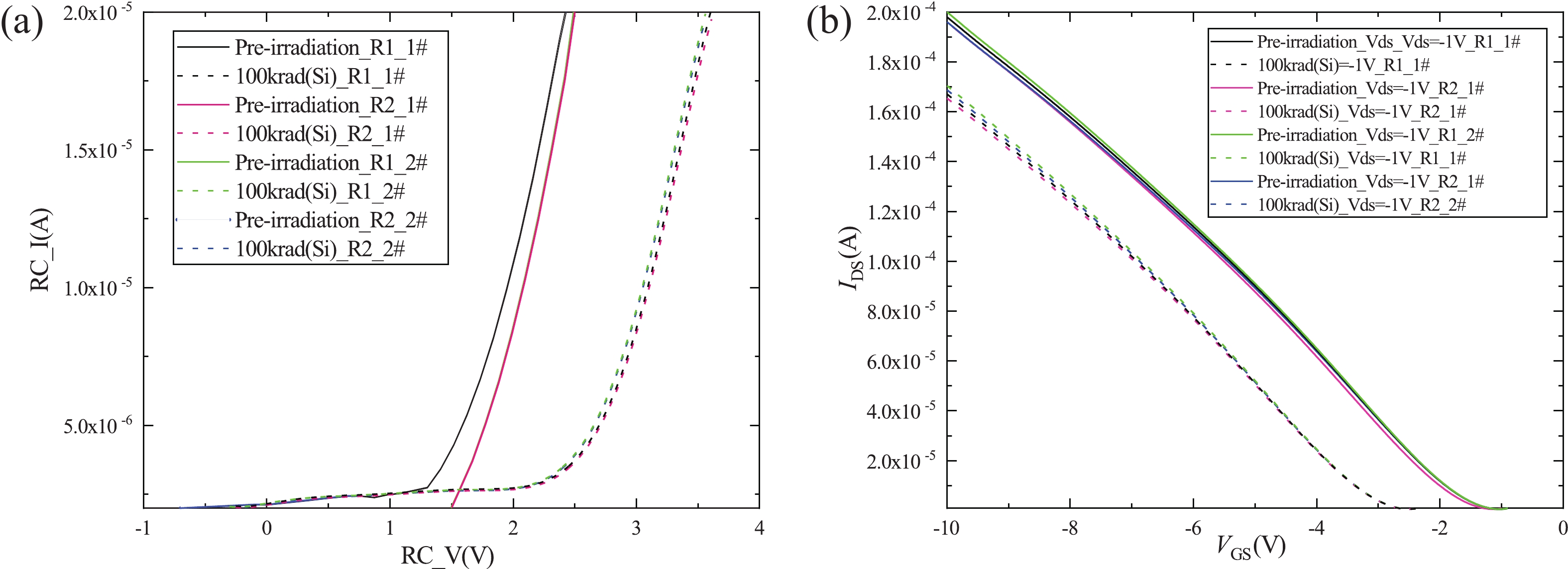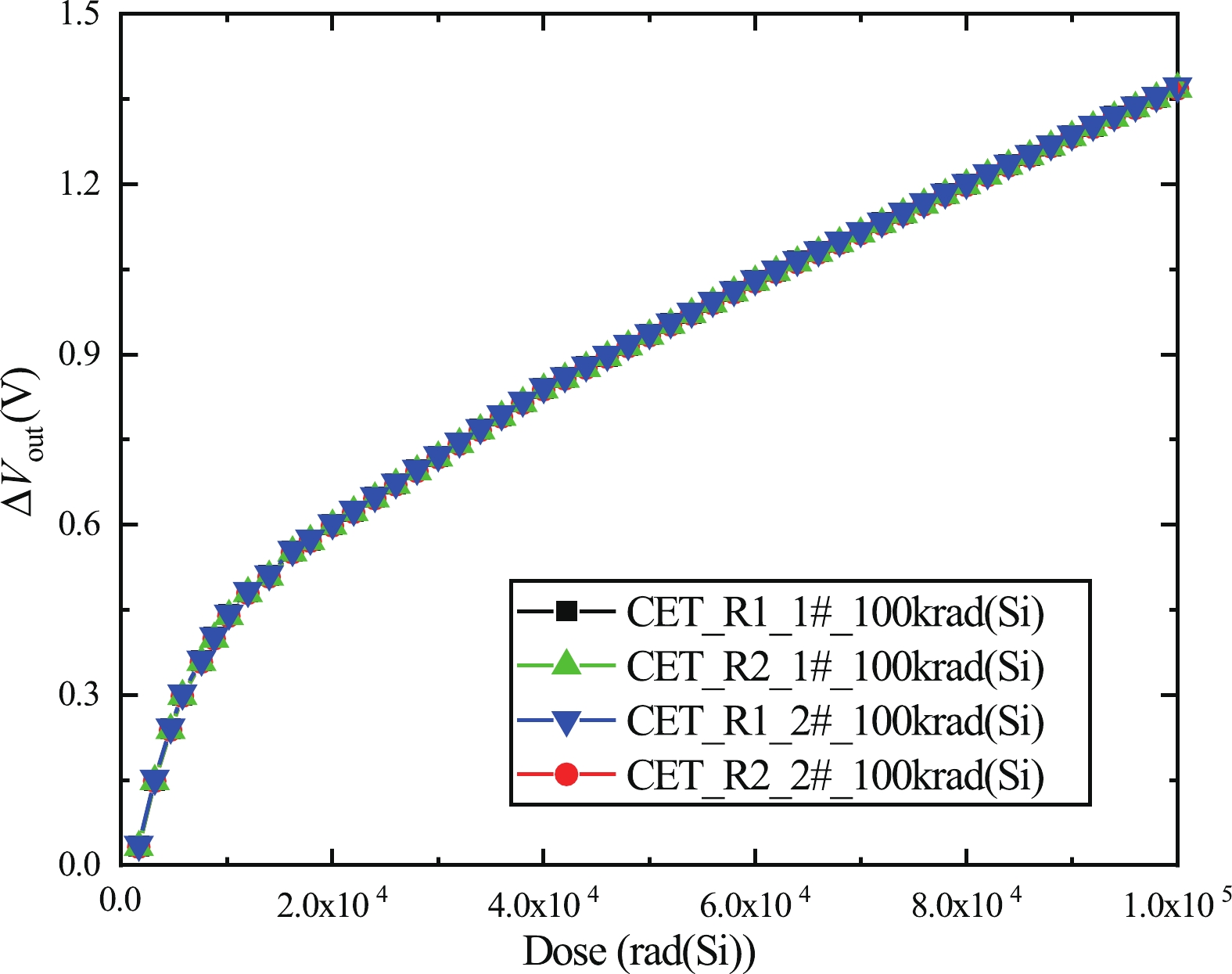 Abstract: The radiation-sensitive field effect transistors (RADFET) radiation dosimeter is a type of radiation detector based on the total dose effects of the p-channel metal?oxide?semiconductor (PMOS) transistor. The RADFET chip was fabricated in United Microelectronics Center 8-inch process with a six-layer photomask. The chip including two identical PMOS transistors, occupies a size of 610 μm × 610 μm. Each PMOS has a W/L ratio of 300 μm/50 μm, and a 400 nm thick gate oxide, which is formed by a dry-wet-dry oxygen process. The wet oxygen-formed gate oxide with more traps can capture more holes during irradiation, thus significantly changing the PMOS threshold voltage. Pre-irradiation measurement results from ten test chips show that the initial average voltage of the PMOS is 1.961 V with a dispersion of 5.7%. The irradiation experiment is conducted in a cobalt source facility with a dose rate of 50 rad(Si)/s. During irradiation, a constant current source circuit of 10 μA was connected to monitoring the shift in threshold voltage under different total dose. When the total dose is 100 krad(Si), the shift in threshold voltage was approximately 1.37 V, which demonstrates that an excellent radiation function was achieved.
