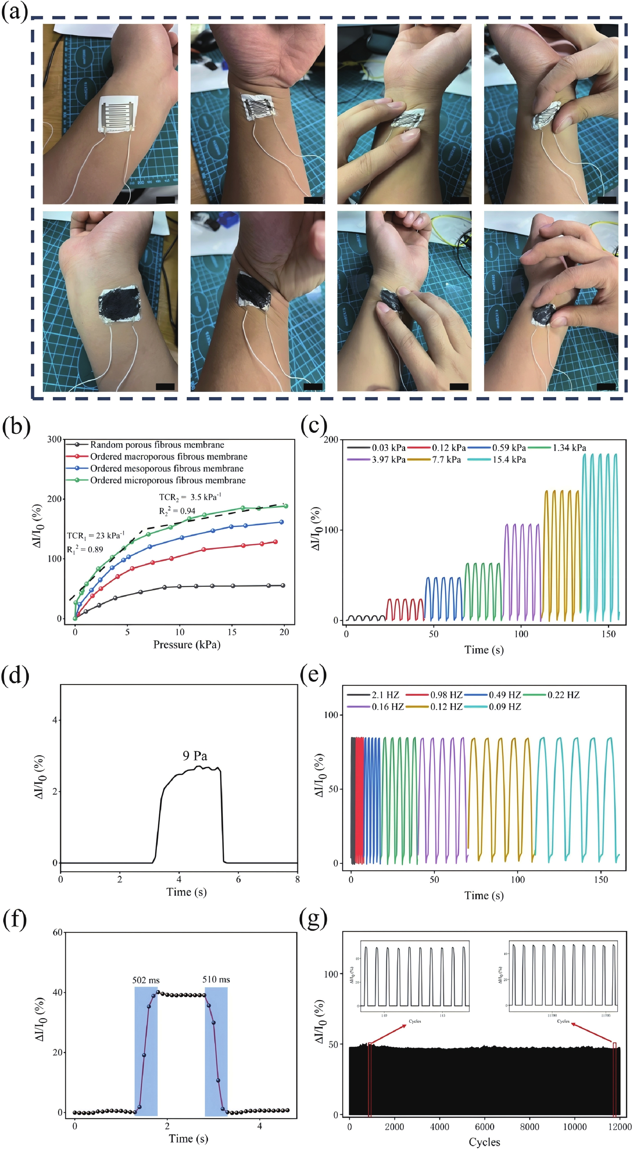 Abstract: The random nanofiber distribution in traditional electrospun membranes restricts the pressure sensing sensitivity and measurement range of electronic skin. Moreover, current multimodal sensing suffers from issues like overlapping signal outputs and slow response. Herein, a novel electrospinning method is proposed to prepare double-coupled microstructured nanofibrous membranes. Through the effect of high voltage electrostatic field in the electrospinning, the positively charged nanofibers are preferentially attached to the negatively charged foam surface, forming the ordered two-dimensional honeycomb porous nanofibrous membrane with three-dimensional spinous microstructure. Compared with the conventional random porous nanofibrous membrane, the bionic two-dimensional honeycomb and three-dimensional spinous dual-coupled microstructures in the ordered porous nanofibrous membrane endows the electronic skin with significantly improved mechanical properties (maximum tensile strain increased by 77% and fatigue resistance increased by 35%), air permeability (water vapor transmission rate increased by 16%) and sensing properties (pressure sensitivity increased by 276% and detection range increased by 137%). Furthermore, the electronic skin was constructed by means of a conformal composite ionic liquid functionalized nanofibrous membrane, and the real-time and interference-free dual-signal monitoring of pressure and temperature (maximum temperature coefficient of resistance: ?0.918 °C?1) was realized.