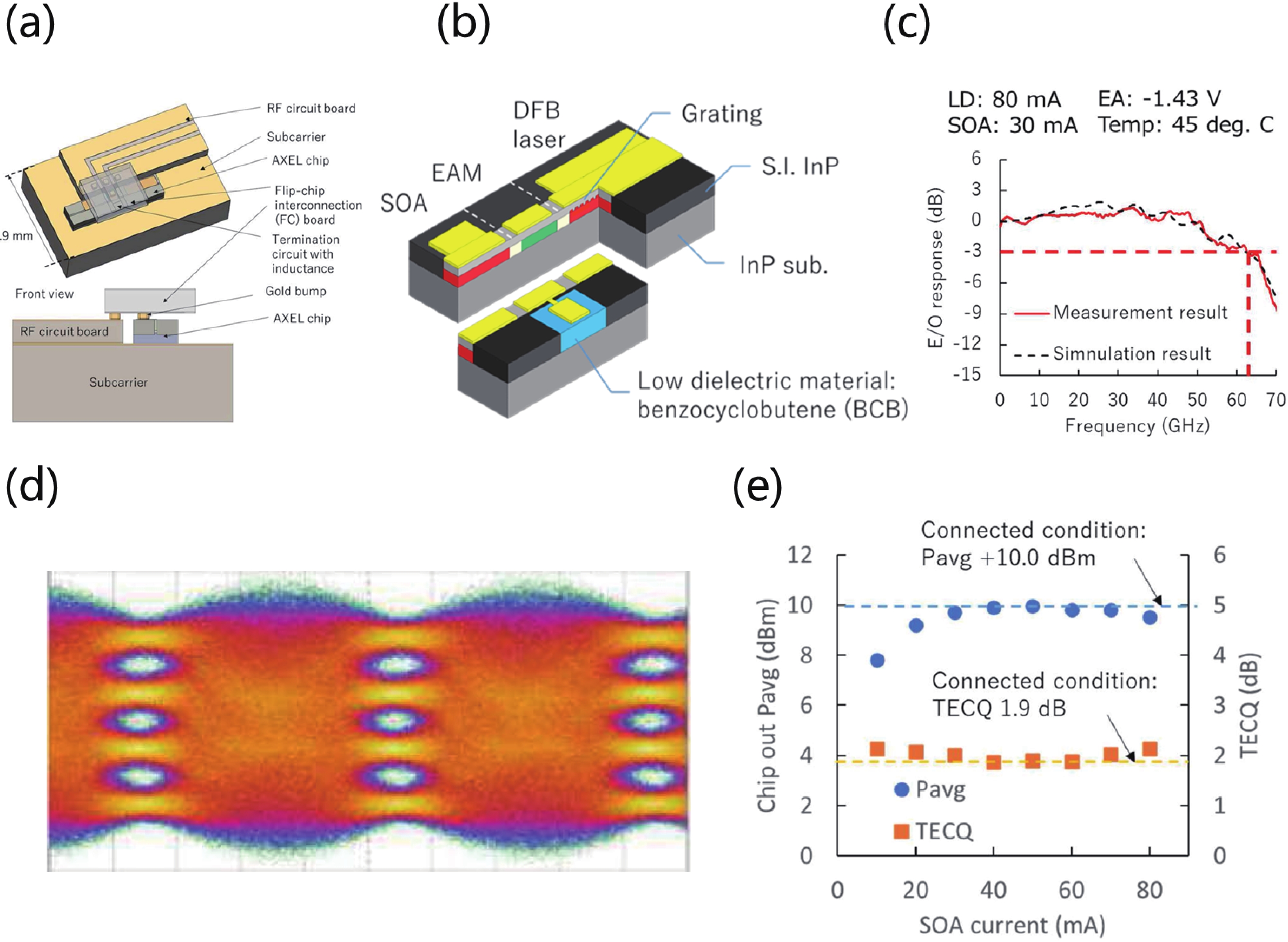 | NTT | 64 | 224 PAM4 | O, C | InGaAsP | AXEL, multi-channel, etc. | Flip chip interconnect, PPR, etc. |