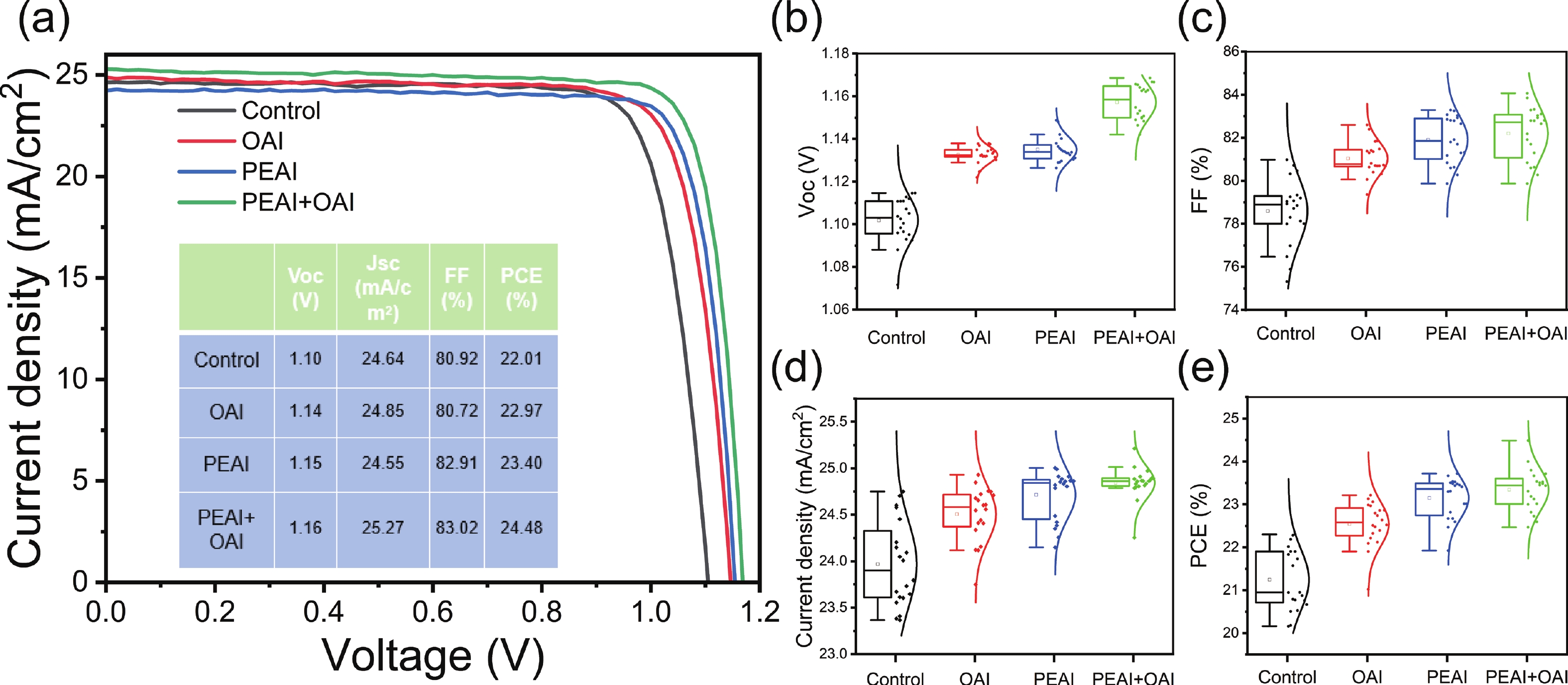 Abstract: Interfacial defects and environmental instability at perovskite surfaces pose significant challenges for inverted perovskite solar cells (PSCs). Surface post-treatment strategies have emerged as a viable approach to improve film quality and passivate defects. Although organic molecules can passivate both surfaces and grain boundaries via hydrogen or covalent bonding, their limited adsorption specificity often results in incomplete defect neutralization. In this work, we introduce a bilayer passivation approach employing phenethylammonium iodide (PEAI) and n-octylammonium iodide (OAI) to concurrently mitigate non-radiative recombination and improve stability. PEAI passivates undercoordinated Pb2+ at grain boundaries and surfaces, effectively eliminating deep-level traps and suppressing non-radiative losses. Meanwhile, OAI forms a hydrophobic barrier on the perovskite surface through its long alkyl chains, inhibiting moisture penetration without compromising interfacial charge transport. As a result, the perovskite film exhibits significantly enhanced optoelectronic performance and environmental stability, achieving a champion power conversion efficiency (PCE) of 24.48%.