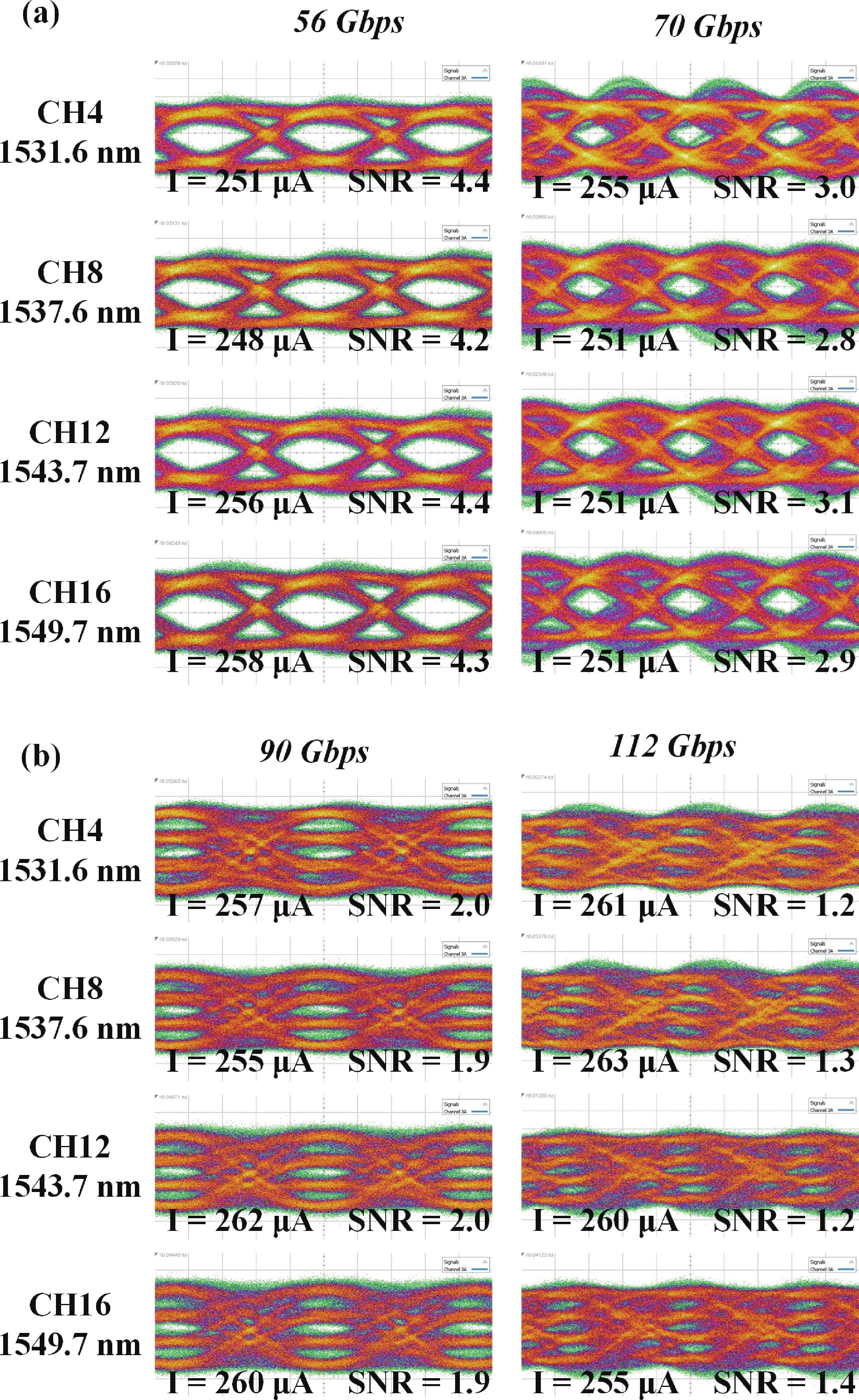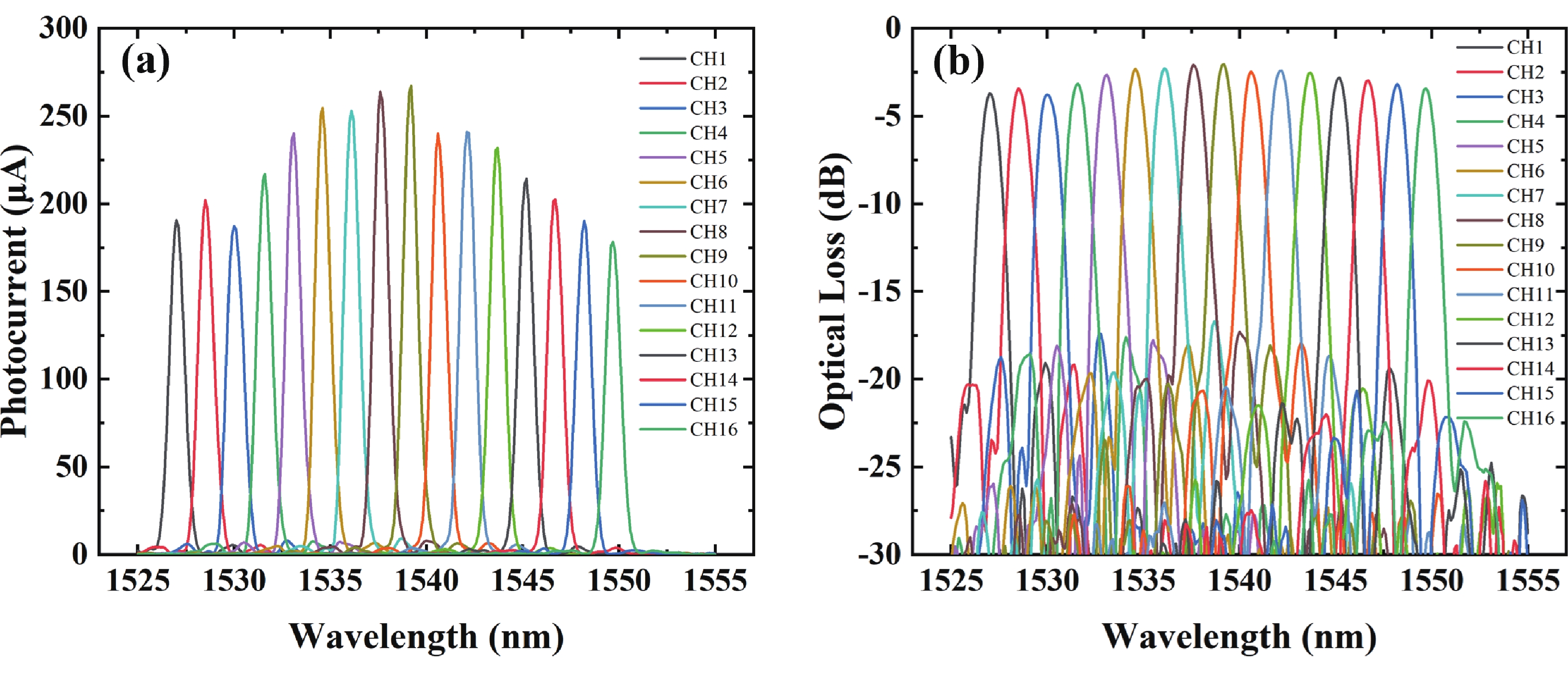 Abstract: Wavelength division multiplexing technology has been pivotal in addressing the demand for high-capacity optical communication with silicon photonics providing a promising platform. This work presents a 16-channel wavelength division multiplexing silicon photonics receiver chip composed of an arrayed waveguide grating and Ge-on-Si photodetectors. Integrated inductors are introduced to enhance the high-speed performance of photodetectors, enabling data rates up to 112 Gbps with high responsivity and low dark current. The operating wavelength range of the arrayed wavelength grating is adjusted according to the response of the Ge-on-Si photodetector. The optical insertion loss, cross talk and central wavelength of the array waveguide grating are 2.1 to 3.7 dB, ?12 to ?15 dB, and 1538 nm, respectively. The proposed receiver chip offers a solution to meet the challenges of modern data transmission requirements.