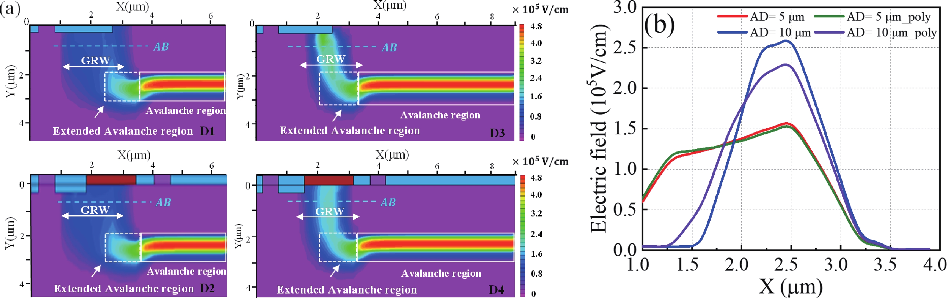 Abstract: A high-sensitivity, low-noise single photon avalanche diode (SPAD) detector was presented based on a 180 nm BCD process. The proposed device utilizes a p-implant layer/high-voltage n-well (HVNW) junction to form a deep avalanche multiplication region for near-infrared (NIR) sensitivity enhancement. By optimizing the device size and electric field of the guard ring, the fill factor (FF) is significantly improved, further increasing photon detection efficiency (PDE). To solve the dark noise caused by the increasing active diameter, a field polysilicon gate structure connected to the p+ anode was investigated, effectively suppressing dark count noise by 76.6%. It is experimentally shown that when the active diameter increases from 5 to 10 μm, the FF is significantly improved from 20.7% to 39.1%, and thus the peak PDE also rises from 13.3% to 25.8%. At an excess bias voltage of 5 V, a NIR photon detection probability (PDP) of 6.8% at 905 nm, a dark count rate (DCR) of 2.12 cps/μm2, an afterpulsing probability (AP) of 1.2%, and a timing jitter of 216 ps are achieved, demonstrating excellent single photon detection performance.