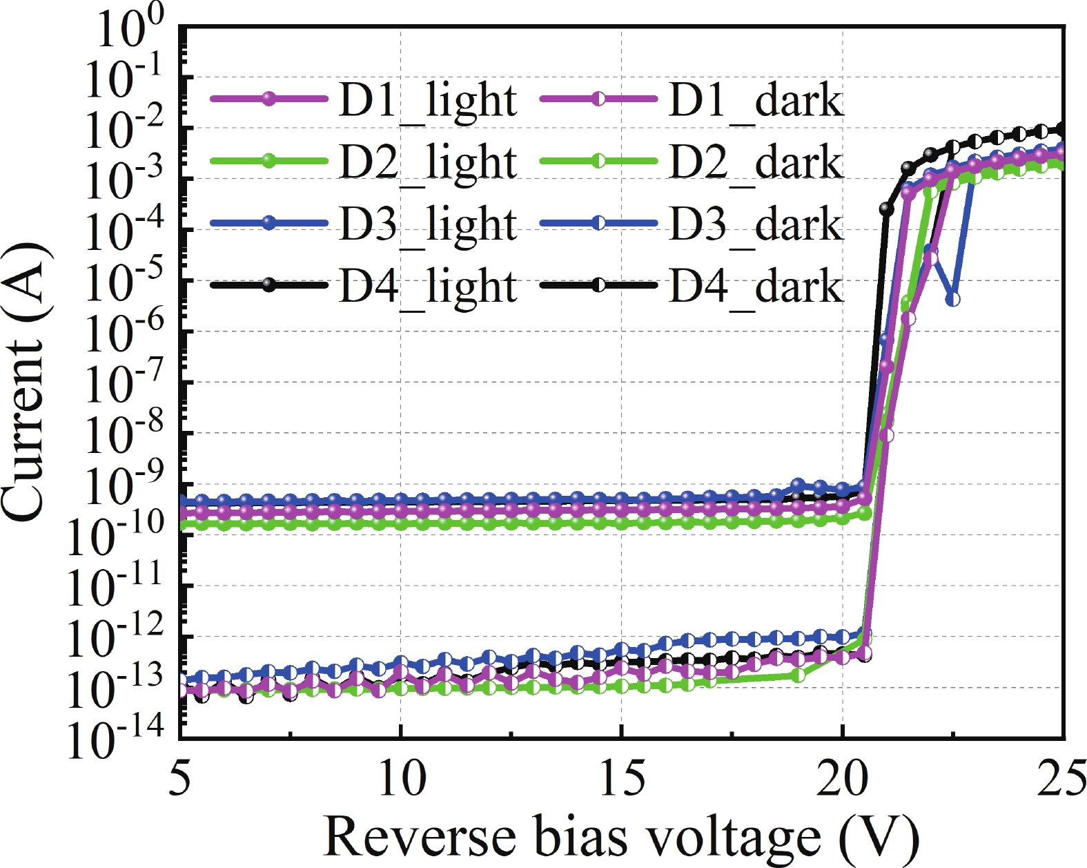 Sun W B, Wang Y X, Liu M L, et al. A back-illuminated 4μm P+N-well single photon avalanche diode pixel array with 0.36Hz/μm2 dark count rate at 2.5 V excess bias voltage. IEEE Electron Device Lett, 2022, 43(9): 1519 doi: 10.1109/LED.2022.3196172