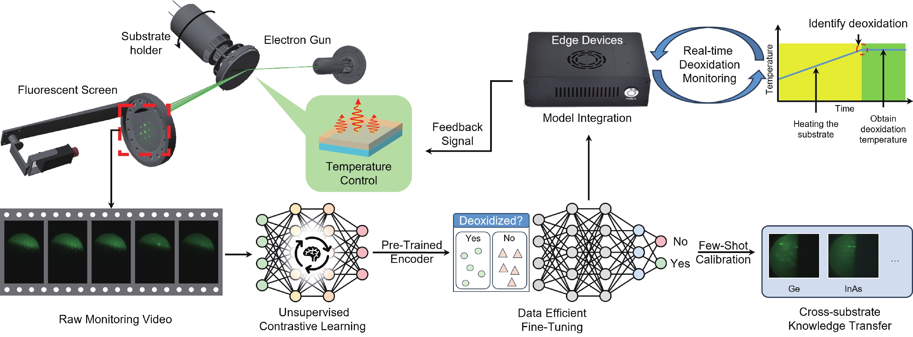 Abstract: Accurate temperature control and effective oxide removal are essential for achieving high-quality epitaxial growth in molecular beam epitaxy (MBE). However, traditional methods often rely on manual identification of reflection high-energy electron diffraction (RHEED) patterns. This process is heavily influenced by the grower’s experience, leading to issues with reproducibility and limiting the potential for automation. In this report, we propose an unsupervised learning framework for real-time RHEED analysis during the deoxidation process. By incorporating temporal similarity constraints into contrastive learning, our model generates smooth and interpretable feature trajectories that illustrate transitions in the deoxidation state, thus eliminating the need for manual labeling. The model, pre-trained using grouped contrastive loss, shows significant improvement in RHEED feature boundary discrimination and localization of critical regions. We evaluated its generalizability through two transfer learning strategies: calibration-free clustering and few-shot fine-tuning. The pre-trained model achieved a clustering accuracy of 88.1% for GaAs deoxidation samples without additional labels and reached an accuracy of 94.3% to 95.5% after fine-tuning with just five sample pairs across GaAs, Ge, and InAs substrates. This framework is optimized for resource-constrained edge devices, allowing for real-time, plug-and-play integration with existing MBE systems and swift adaptation across various materials and equipment. This work paves the way for greater automation and improved reproducibility in semiconductor manufacturing.
