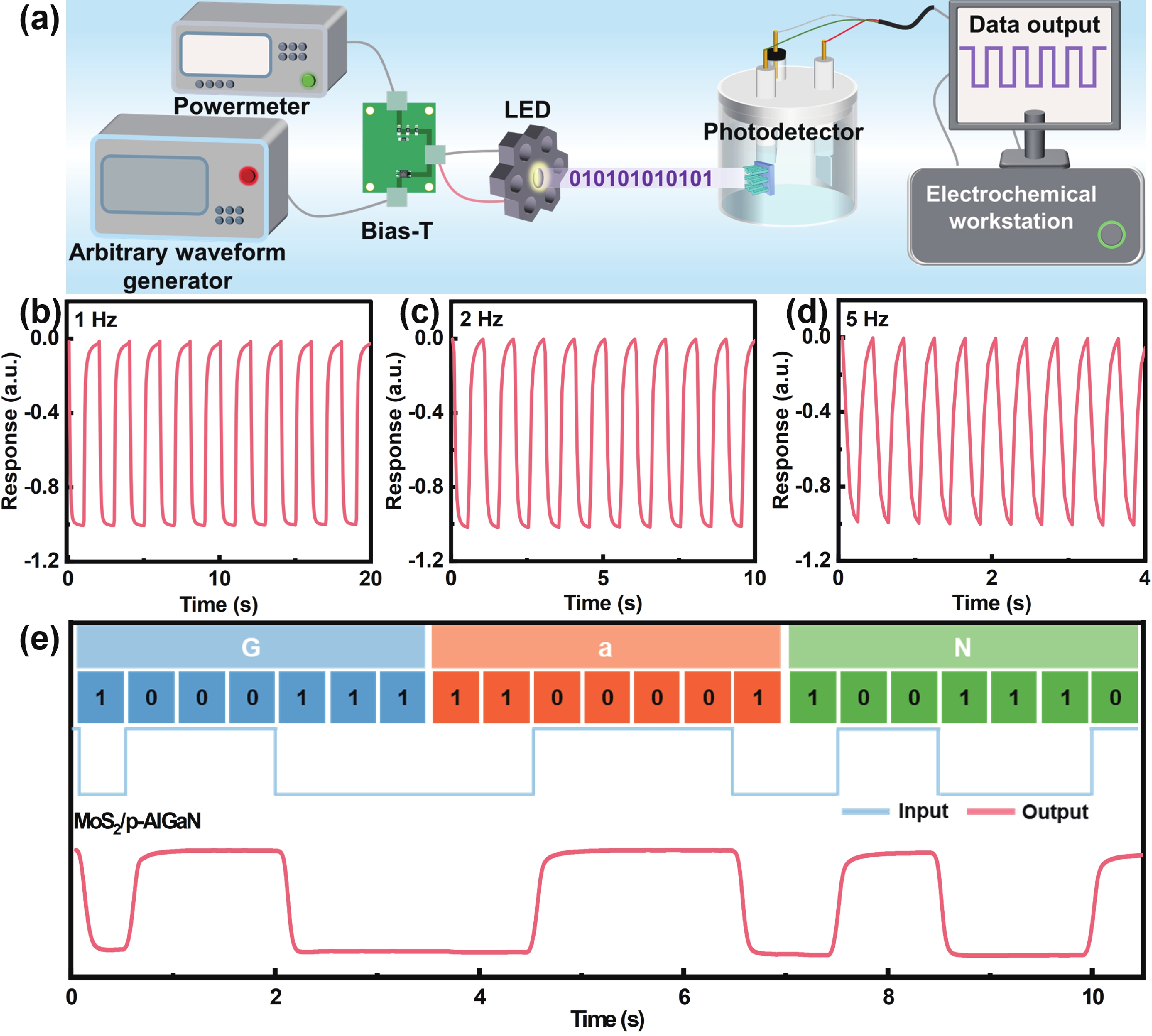 Abstract: Solar-blind ultraviolet photodetectors (UV PDs), capable of detecting UV radiation without interference from sunlight, have attracted significant interest. Herein, we propose a 0D/1D heterostructure for UV PDs, which was fabricated by spin-coating MoS2 quantum dots onto p-AlGaN nanowires. The device achieves a high responsivity of 175.5 mA/W and a fast response speed of 83 ms at 250 nm illumination under self-powered mode, which improved nearly 1235% and 521% after MoS2 decoration, respectively. These improvements can be attributed to the type-Ⅱ heterostructure formed between p-AlGaN and MoS2, which facilitates enhanced charge separation and carrier transport. Later, we demonstrate the implementation of this device in optical communication, achieving high-accuracy transmission of "GaN" ASCII code signals. Such a 0D/1D heterostructure provides an effective strategy for high-performance solar-blind UV PD.