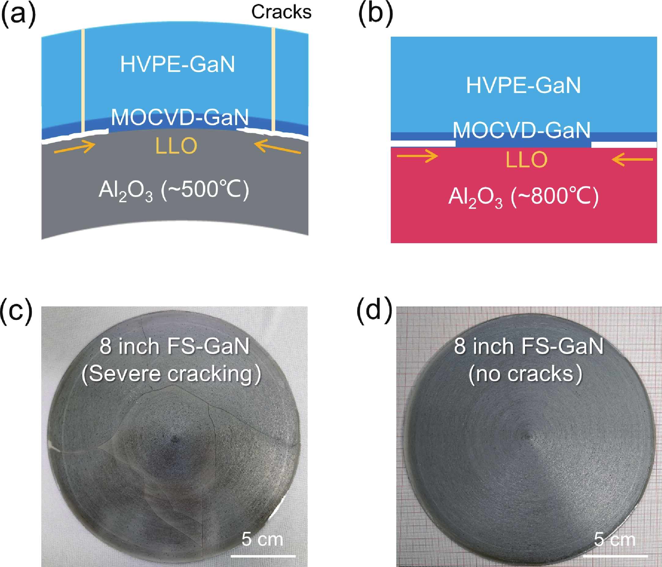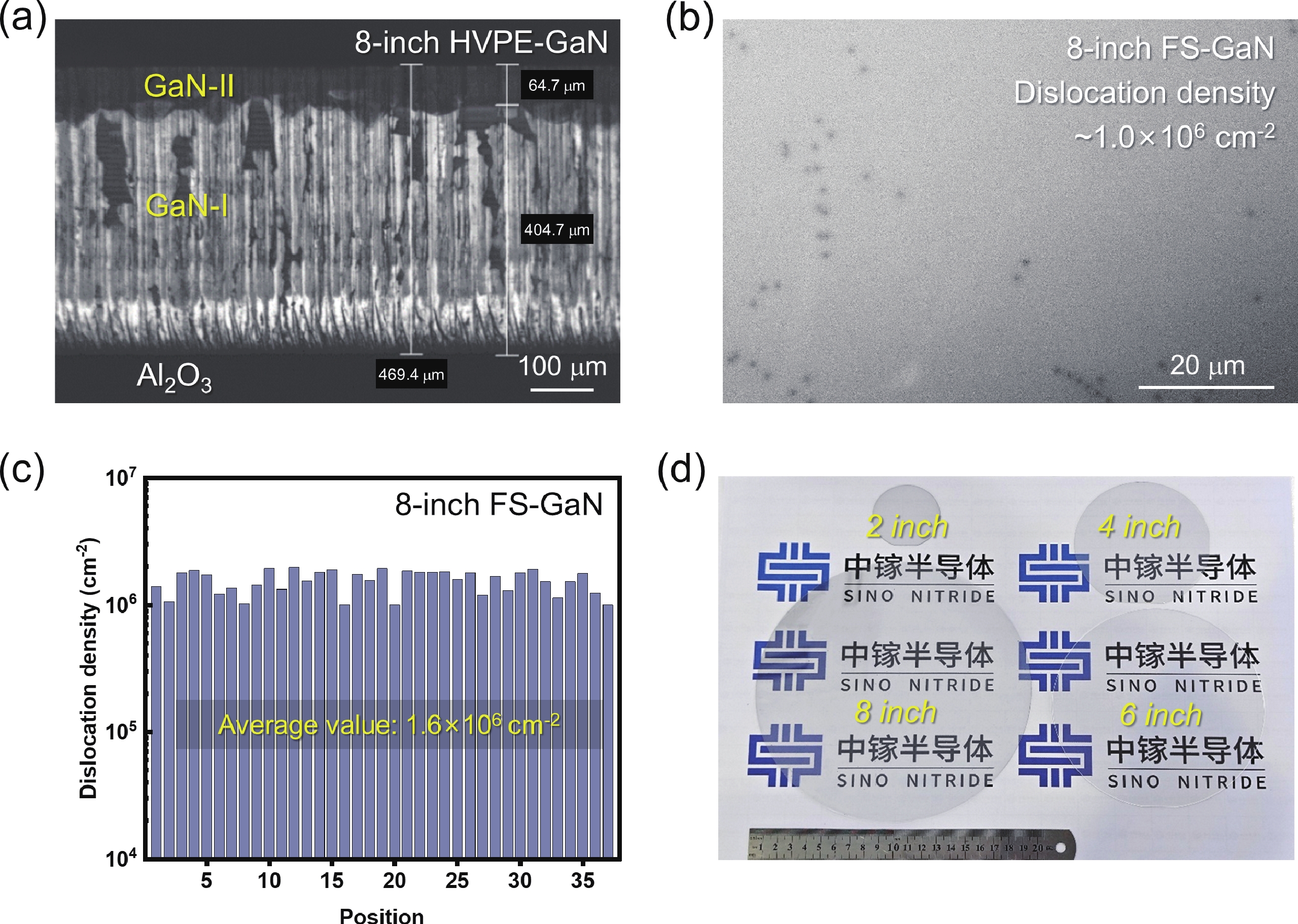 Abstract: The absence of large-size gallium nitride (GaN) substrates with low dislocation density remains a primary bottleneck for advancing GaN-based devices. Here, we demonstrate the achievement of 8-inch freestanding GaN substrates grown by hydride vapor phase epitaxy. Critical to this achievement is the improvement in gas-flow uniformity, which ensures exceptional thickness homogeneity and enables the crack-free growth of GaN. After laser lift-off (LLO) separation, the freestanding GaN substrate exhibits superior crystal quality, evidenced by full width at half maximum values of 68 and 54 arcsec for X-ray diffraction rocking curves of (002) and (102) planes, alongside a low dislocation density of 1.6 × 106 cm?2. This approach establishes a robust pathway for the production of large-size GaN substrates, which are essential for advancing next-generation power electronics and high-efficiency photonics.