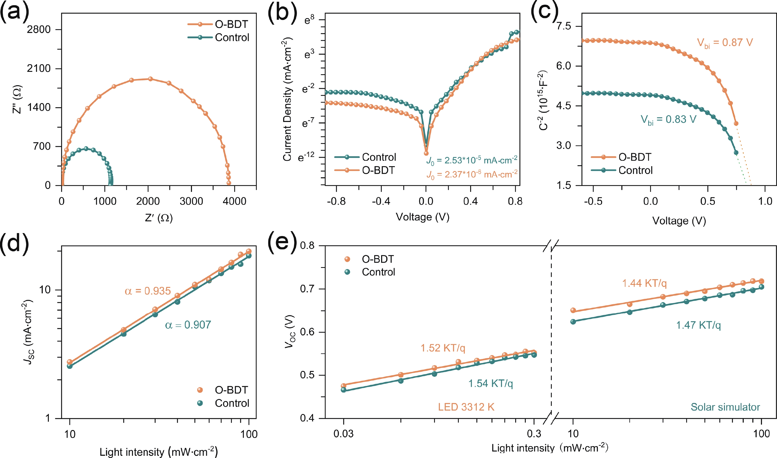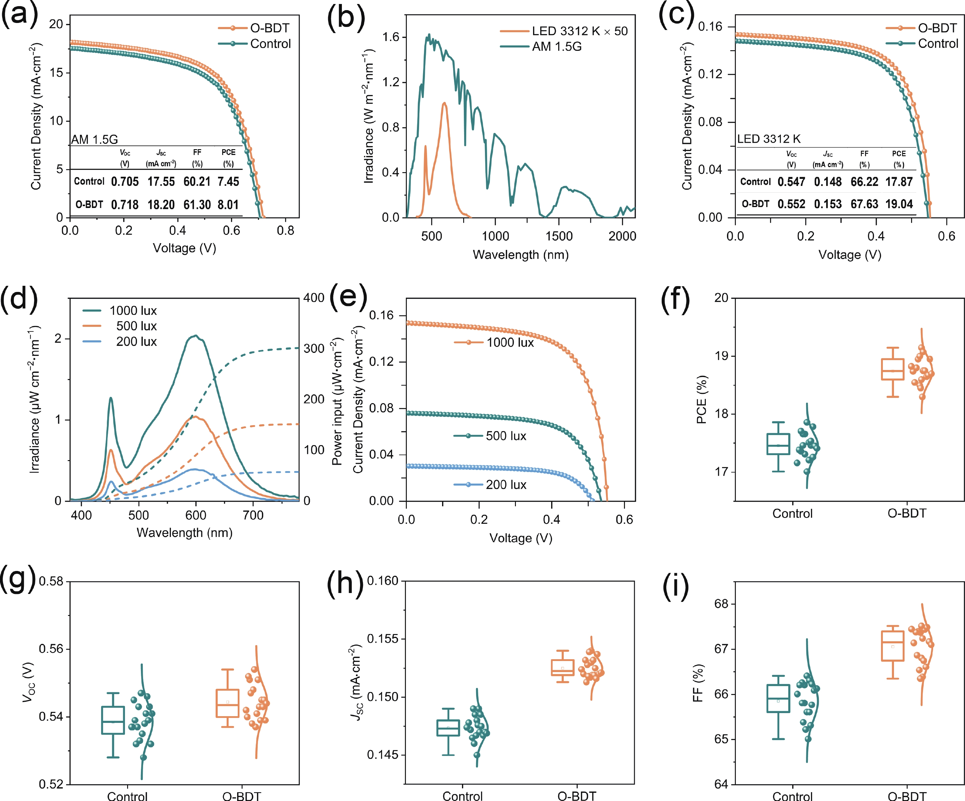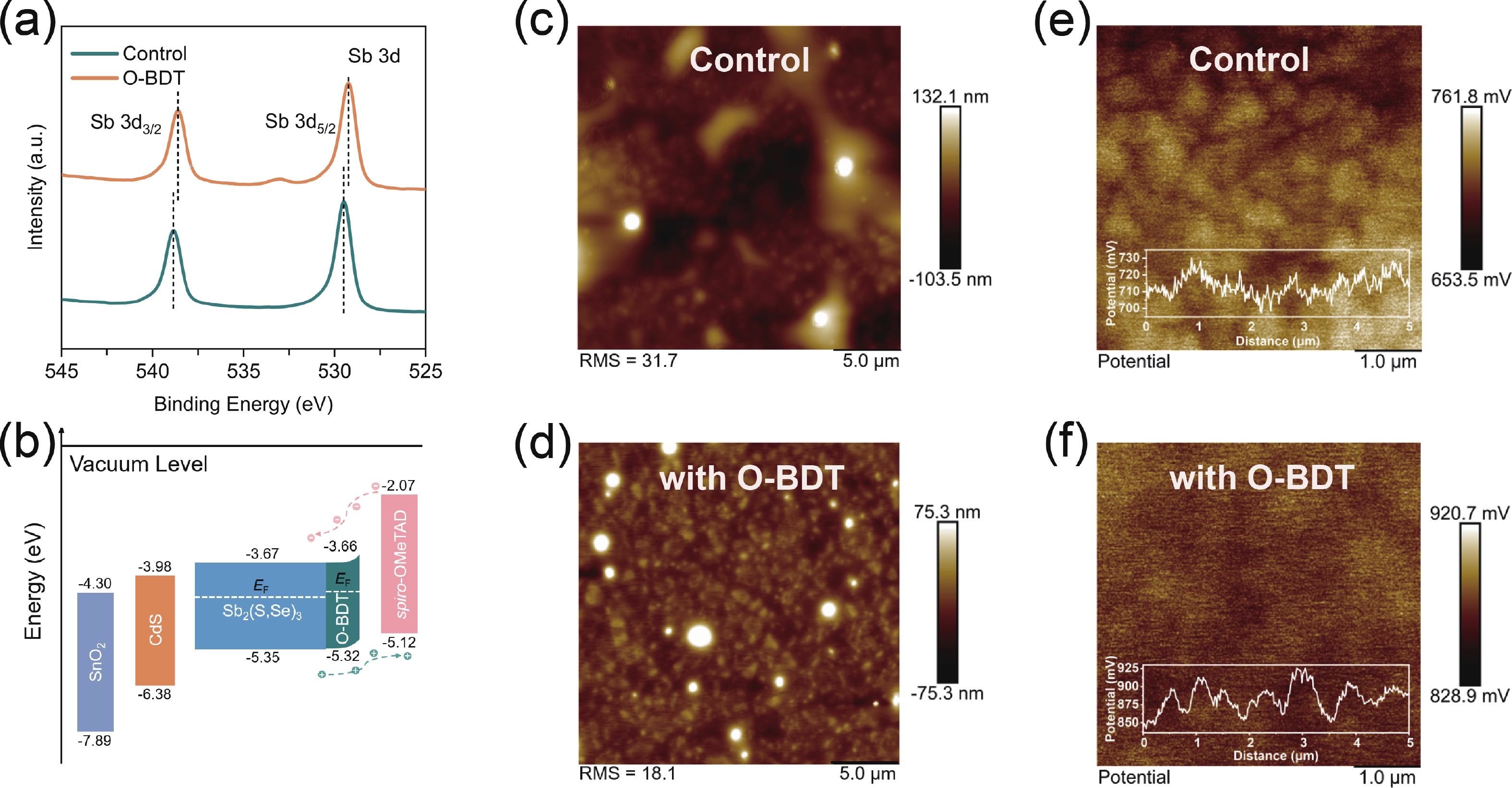 Abstract: Antimony selenosulfide (Sb2(S,Se)3) is a promising photovoltaic absorber material for both outdoor and indoor application scenarios. Nevertheless, the performance of Sb2(S,Se)3 solar cells remains constrained by the severe interface trap-induced nonradiative recombination. Interface engineering has been recognized as an effective approach to suppress recombination and boost charge transport. In this work, we introduce an organic modifier (O-BDT) between Sb2(S,Se)3 absorber and hole transport layer. The theoretical and experimental results evidence that O-BDT can simultaneously passivates interface defects and optimizes the energy-level alignment, leading to a significantly reduced voltage loss. Finally, the O-BDT modified solar cell achieves a power conversion efficiency (PCE) of 8.01% under AM 1.5G illumination. Moreover, the device delivers a PCE of 19.04% under 1000 lux, 3312 K LED lighting, among the best list of IPVs based on antimony chalcogenide compounds.