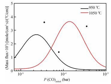 Fig. 1.  Mass flux of Ga$_{2}$O$_{3}$ grown by CVT as a function of the pressure of CO in the system of (Ga$_{2}$O$_{3}+$C). The solid line is the result of numerical simulation, and the $\blacklozenge$ is the experimental results.