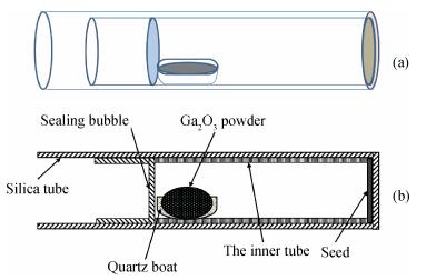 Fig. 2.  The diagram of Ga$_{2}$O$_{3}$ crystal growth by CVT. (a) The perspective drawing and (b) the cross-section drawn.