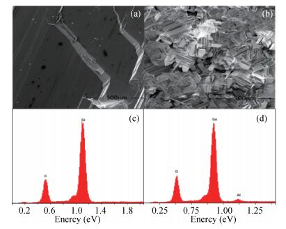 Fig. 3.  (Color online) (a, b) SEM images of the Ga$_{2}$O$_{3}$ crystals. EDS spectrum of (c) crystal surface and (d) the crystal interface with the sapphire.