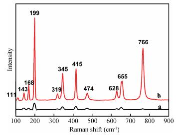 Fig. 5.  Raman scattering spectra of (a) the pure $\beta $-Ga$_{2}$O$_{3}$ power and (b) the Ga$_{2}$O$_{3}$ crystals.