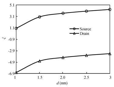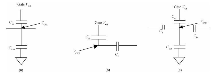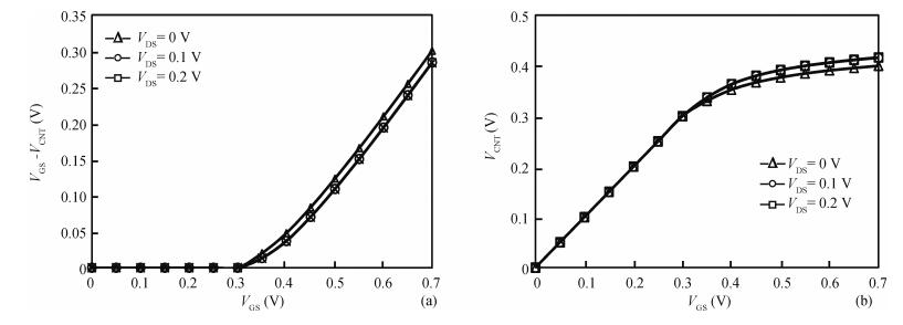 Table 1. $V_{\mathrm{GS}}$-$V_{\mathrm{CNT}}$ values for different capacitance models at different $V_{\mathrm{DS}}$.
