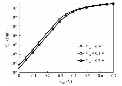 Table 2. $C_{\mathrm{G}}$-$V_{\mathrm{GS}}$ values for different capacitance models at different $V_{\mathrm{DS}}$.