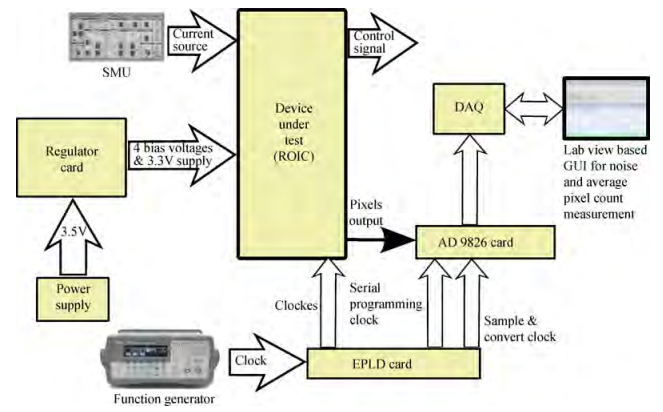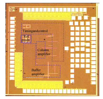 Abstract: Current mirror integration (CMI) read out integrated circuit (ROIC) topology provides a low input impedance to photo-detectors and provides large injection efficiency, large charge handling capacity and snapshot mode operation without in-pixel opamps. The ROIC described in this paper has been implemented with a modified current mirror circuit, with matched PMOS pairs for detector input stage and its biasing. The readout circuit has been designed for 30×30μm2 pixel size, 4×4 array size, variable frame rate, 5 Mega pixel per second (Mpps). Experimental performance of the test chip has achieved 15 Me charge handling capacity, a high dynamic range of 83 dB, 99.8% linearity and 99.96% injection efficiency. The ROIC design has been fabricated in 3.3 V 1P6M UMC 180 nm CMOS process and tested up to 5 MHz pixel rate at room and at cryogenic temperature.