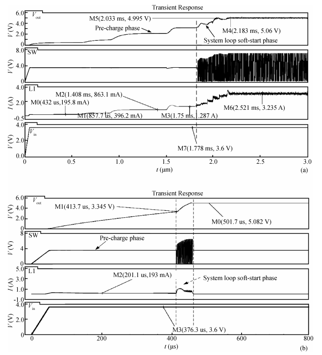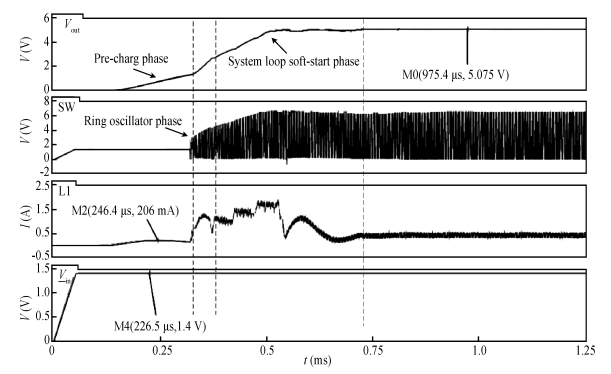 Abstract: This paper presents a load adaptive soft-start scheme through which the inductor current of the synchronous boost DC-DC converter can trace the load current at the start-up stage. This scheme effectively eliminates the inrush-current and over-shoot voltage and improves the load capability of the converter. According to the output voltage, the start-up process is divided into three phases and at each phase the inductor current is limited to match the load. In the pre-charge phase, a step-increasing constant current gives a smooth rise of the output voltage which avoids inrush current and ensures the converter successfully starts up at different load situations. An additional ring oscillator operation phase enables the converter to start up as low as 1.4 V. When the converter enters into the system loop soft-start phase, an output voltage and inductor current detection methods make the transition of the phases smooth and the inductor current and output voltage rise steadily. Effective protection circuits such as short-circuit protection, current limit circuit and over-temperature protection circuit are designed to guarantee the safety and reliability of the chip during the start-up process. The proposed start-up circuit is implemented in a synchronous boost DC-DC converter based on TSMC 0.35μm CMOS process with an input voltage range 1.4-4.2 V, and a steady output voltage 5 V, and the switching frequency is 1 MHz. Simulation results show that inrush current and overshoot voltage are suppressed with a load range from 0-2.1 A, and inductor current is as low as 259 mA when the output shorts to the ground.