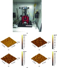 Fig. 5.  (a) AFM microscopy apparatus used in the surface morphology characterization. (b) Microscopy AFM of (1) undoped ZnO,(2) ZnO with 3\% Al-doping concentration,(3) ZnO with 5\% Al,(4) ZnO with 10\% Al.