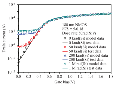 Abstract: In this paper, total ionizing dose effect of NMOS transistors in advanced CMOS technology are examined. The radiation tests are performed at 60Co sources at the dose rate of 50 rad (Si)/s. The investigation's results show that the radiation-induced charge buildup in the gate oxide can be ignored, and the field oxide isolation structure is the main total dose problem. The total ionizing dose (TID) radiation effects of field oxide parasitic transistors are studied in detail. An analytical model of radiation defect charge induced by TID damage in field oxide is established. The I-V characteristics of the NMOS parasitic transistors at different doses are modeled by using a surface potential method. The modeling method is verified by the experimental I-V characteristics of 180 nm commercial NMOS device induced by TID radiation at different doses. The model results are in good agreement with the radiation experimental results, which shows the analytical model can accurately predict the radiation response characteristics of advanced bulk CMOS technology device.