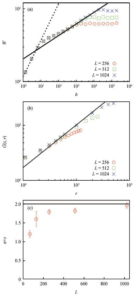 Fig. 2.  (Color online) Kinetic roughening of the growth front of the BD model without diffusion. (a) Log-log plot of growth front width W versus average height h for various system sizes L. (b) Log-log plot of asymptotic height-difference correlation function $G(r)$ versus distance r for various system sizes. (c) Sum of scaling exponents $\alpha+z$ versus system size L. The value asymptotically approaches a constant 2. Every data point is obtained by averaging 100 samples.