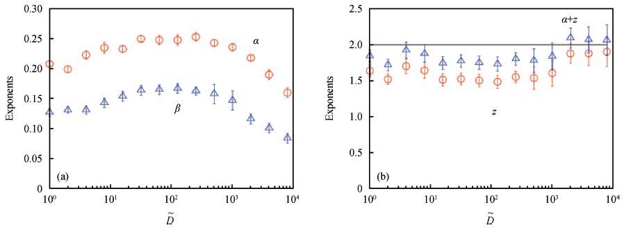 Fig. 3.  (Color online) Kinetic roughening exponents, (a) α (circle) and β (triangle), and (b) z (circle) and α+ z (triangle) of the growth front versus surface diffusion rate $\tilde D$ . The system size is set L = 256.
