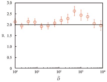 Fig. 6.  (Color online) The product $\gamma$ z with the coarsening exponent $\gamma$ for various diffusion rates $\tilde D$ . Error bars represent the standard deviation. The system size is L = 256. Solid line represents d = 2.