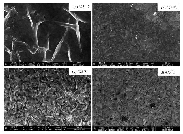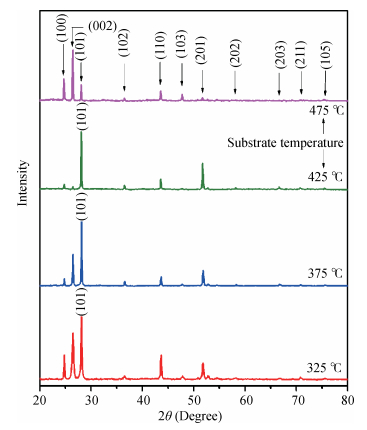 Abstract: Thin films of CdS have been prepared by chemical spray pyrolysis by spraying precursor solution directly onto soda lime glass(SLG) substrates. Influence of substrate temperature on structural, optical, morphological and electrical properties have been investigated by using various techniques such as low angle X-ray diffraction(XRD), Raman spectroscopy, X-ray photoelectron spectroscopy(XPS), field emission scanning electron microscopy(FESEM), atomic force microscopy(AFM), transmission electron microscopy(TEM), UV-visible spectroscopy photoluminescence(PL) spectroscopy etc. Formation of CdS has been confirmed by low angle XRD, Raman spectroscopy and XPS analysis. XRD pattern showed that CdS films are polycrystalline, have hexagonal structure and prefer orientation of crystallites shifts from(101) to(002) with increase in substrate temperature. Raman spectroscopy revealed that exciton-phonon coupling depends on substrate temperature and hence on crystallite size. Optical band gap increased from 2.43 to 2.99 eV when substrate temperature increased from 325 to 475℃. Transmittance of the film also showed an increasing trend from ~52% to ~80% with increase in substrate temperature. Such high band gap and transmittance values of CdS films prepared at 475℃ make it a useful window material in CdS/CdTe and CdS/Cu2S heterojunction solar cells.