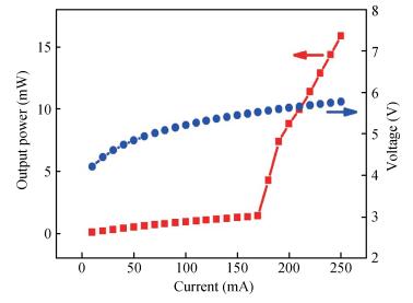 Abstract: Two kinds of continuous-wave GaN-based ultraviolet laser diodes (LDs) operated at room temperature and with different emission wavelengths are demonstrated.The LDs epitaxial layers are grown on GaN substrate by metalorganic chemical vapor deposition, with a 10×600 μm2 ridge waveguide structure.The electrical and optical characteristics of the ultraviolet LDs are investigated under direct-current injection at room temperature. The stimulated emission peak wavelength of first LD is 392.9 nm, the threshold current density and voltage is 1.5 kA/cm2 and 5.0 V, respectively.The output light power is 80 mW under the 4.0 kA/cm2 injection current density. The stimulated emission peak wavelength of second LD is 381.9 nm, the threshold current density the voltage is 2.8 kA/cm2 and 5.5 V, respectively.The output light power is 14 mW under a 4.0 kA/cm2 injection current density.