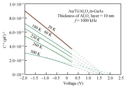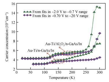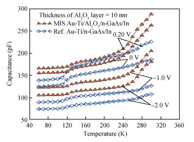 Table 1. Experimental diode parameters from C-2-V characteristics for the reference Au/Ti/n-GaAs and MIS Au/Ti/Al2O3/n-GaAs structures in the temperature range of 60-300 K with steps of 20 K. The data of the Ⅱ. CV region corresponding to (-0.7 V)-(+0.2 V) range in the C-2-V curve at any temperature were given in the table. Vn is the potential difference between Fermi level and the conduction band edge in the neutral region.